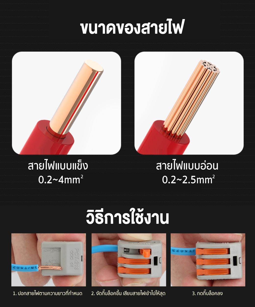 - สายไฟแข็ง (Solid wire) : 0.5-4mm²