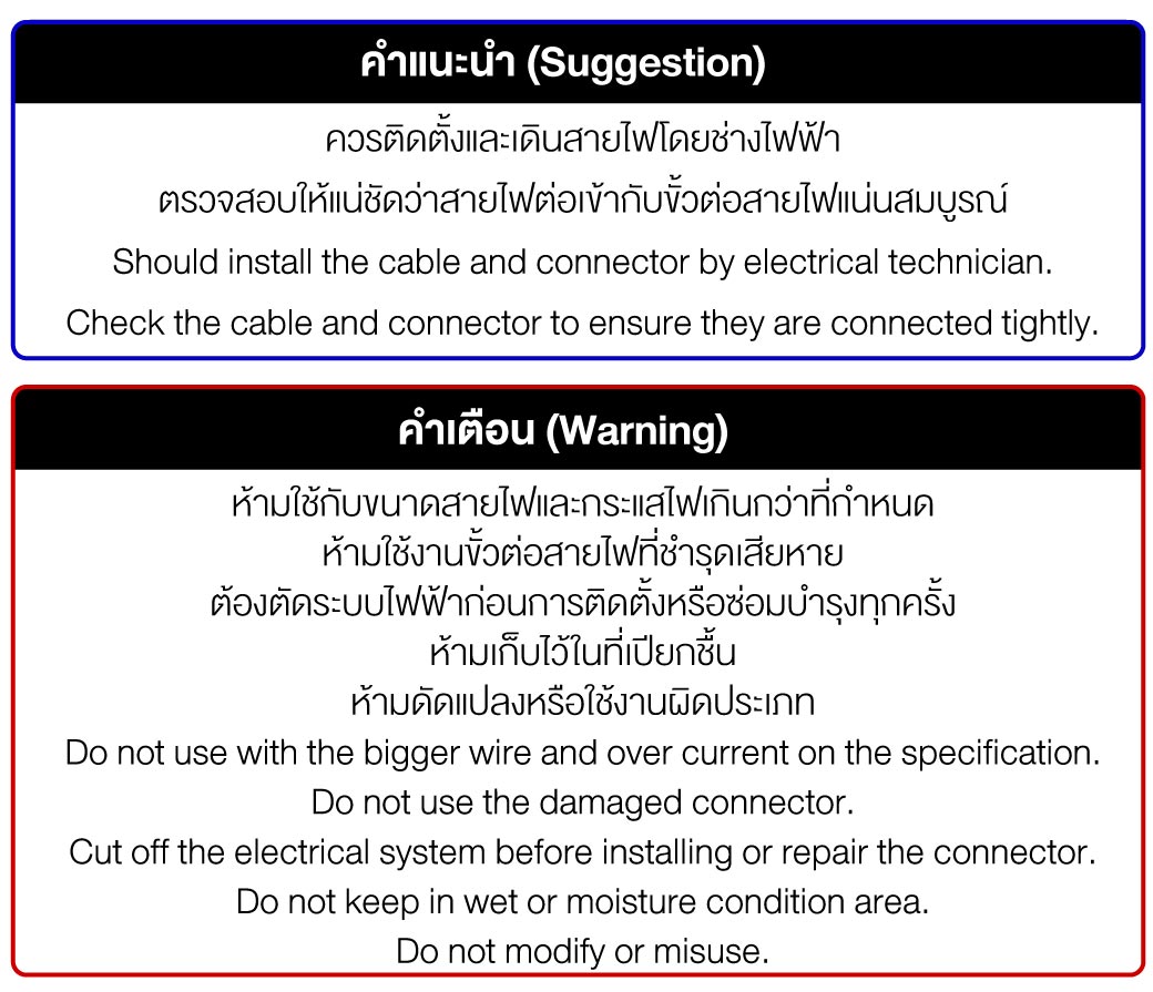 • ห้ามใช้กับขนาดสายไฟ และกระแสไฟเกินกว่าที่กำหนด