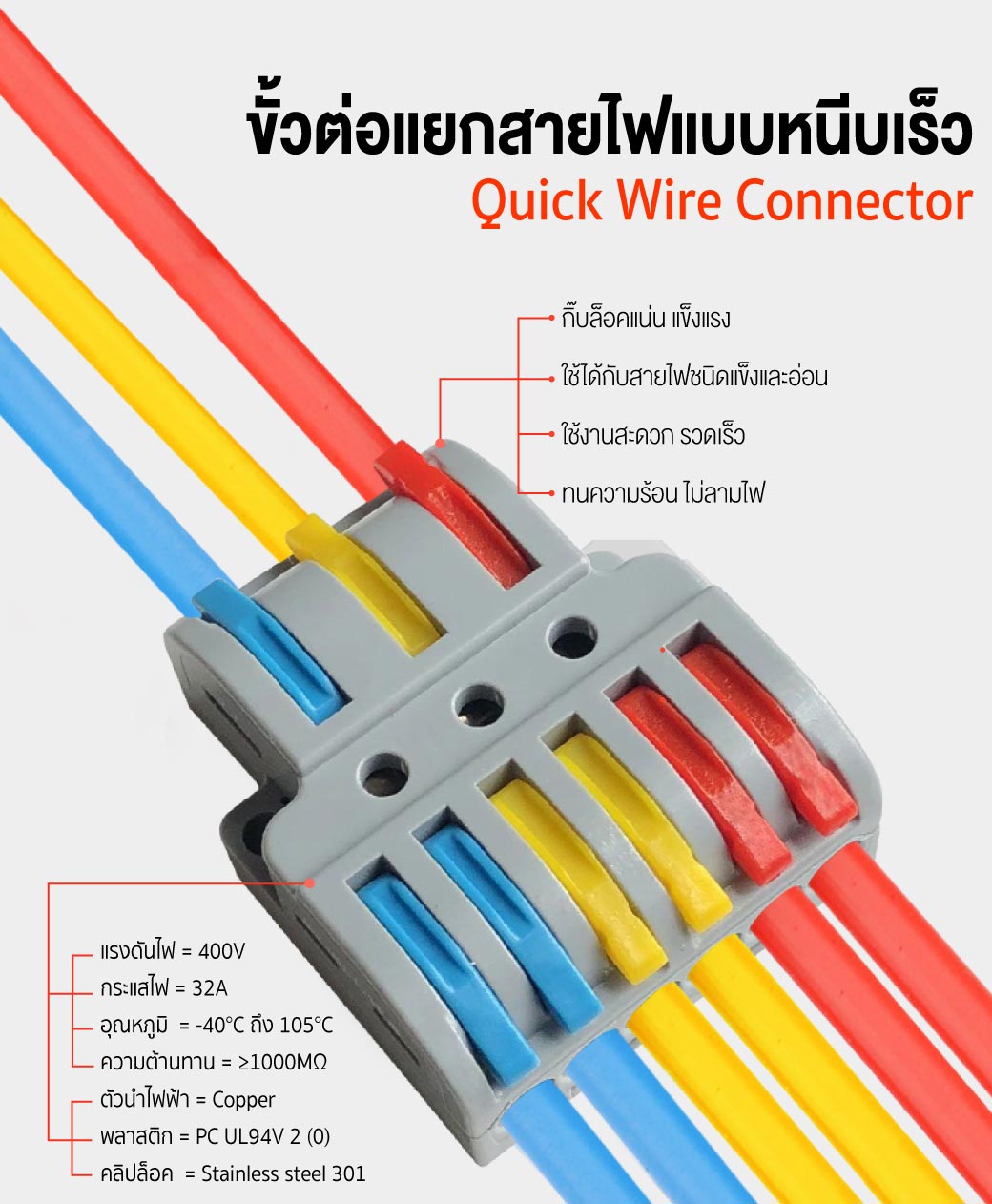 • กิ๊บล็อคแบบสีแยกสายไฟได้ชัดเจน