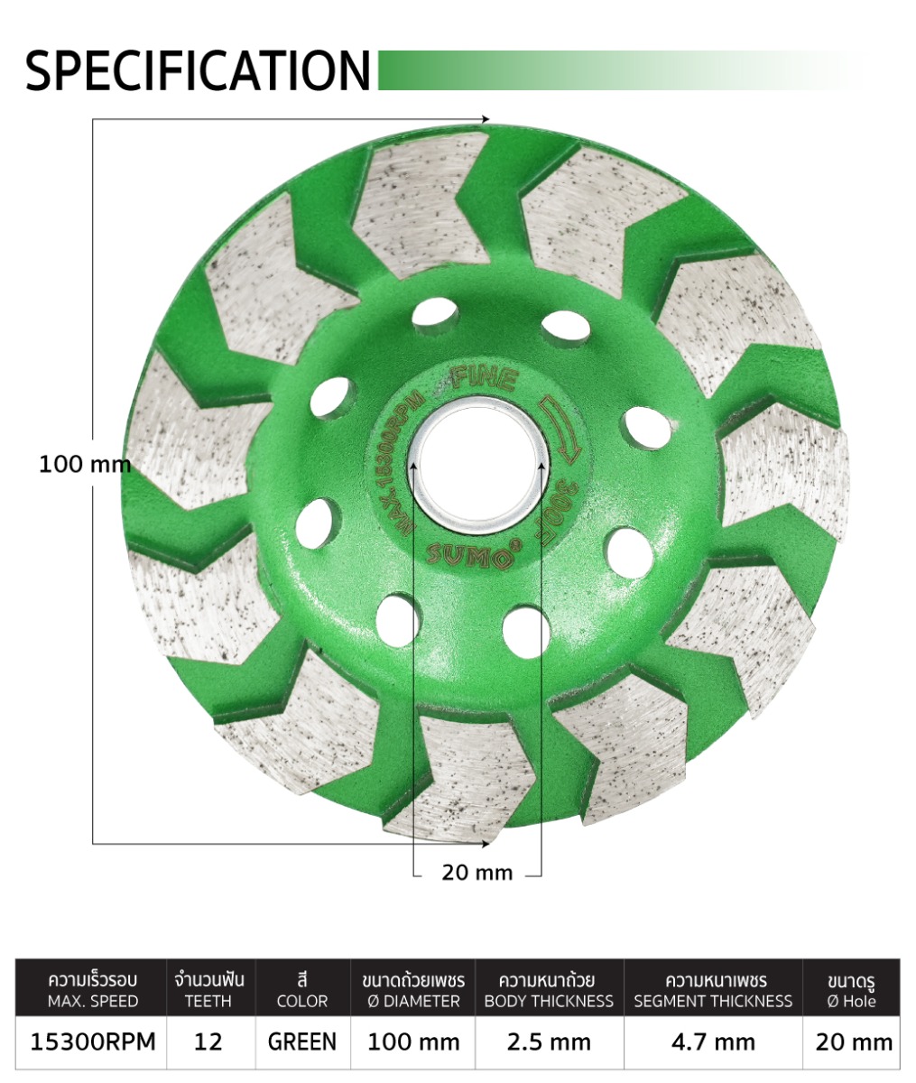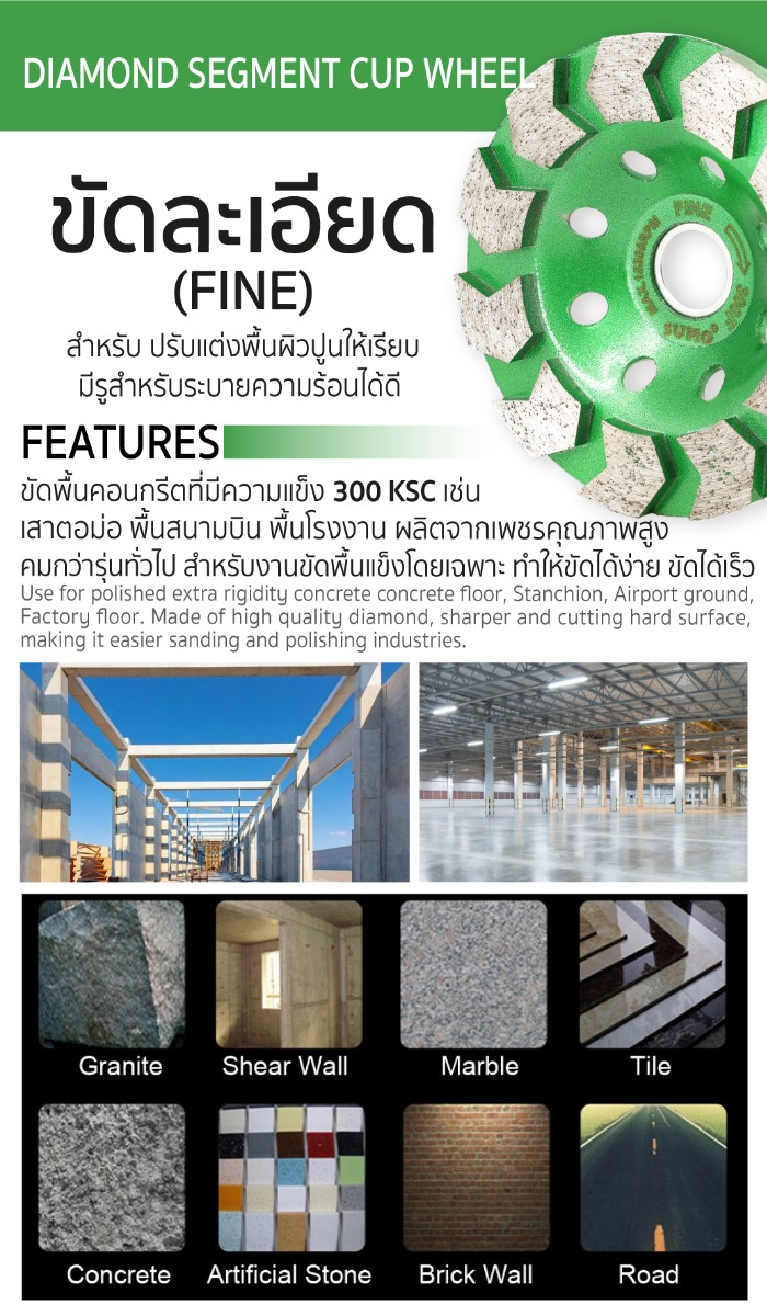 • ผลิตจากเพชรคุณภาพสูง คมกว่าทั่วไป สำหรับงานขัดพื้นแข็งโดยเฉพาะทำให้ขัดได้ง่าย ขัดได้เร็ว