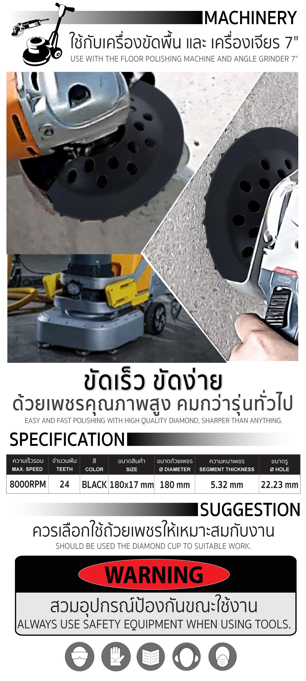 • ใช้กับเครื่องขัดพื้นและเครื่องเจียร 7"