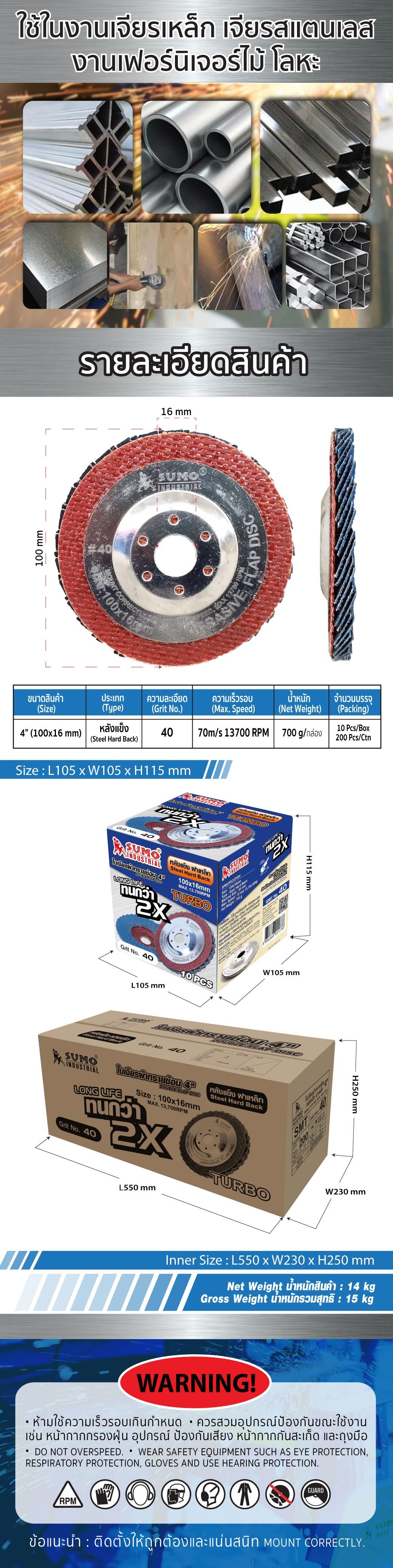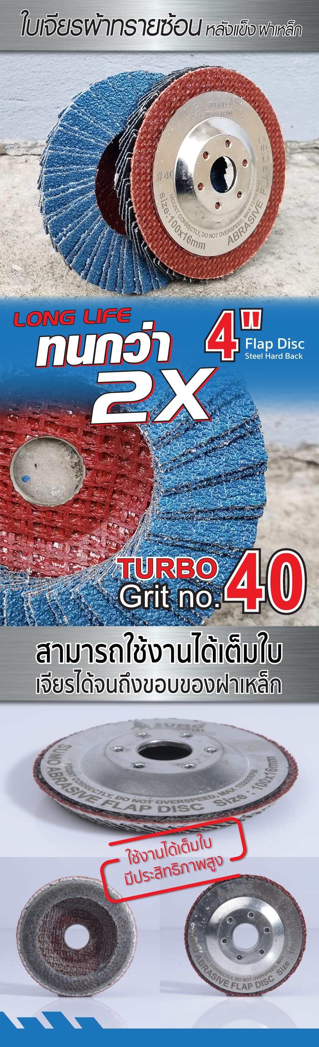 คุณกำลังรีวิว:ใบเจียรผ้าทรายซ้อน 4" No.40 หลังแข็ง Turbo ฝาเหล็ก