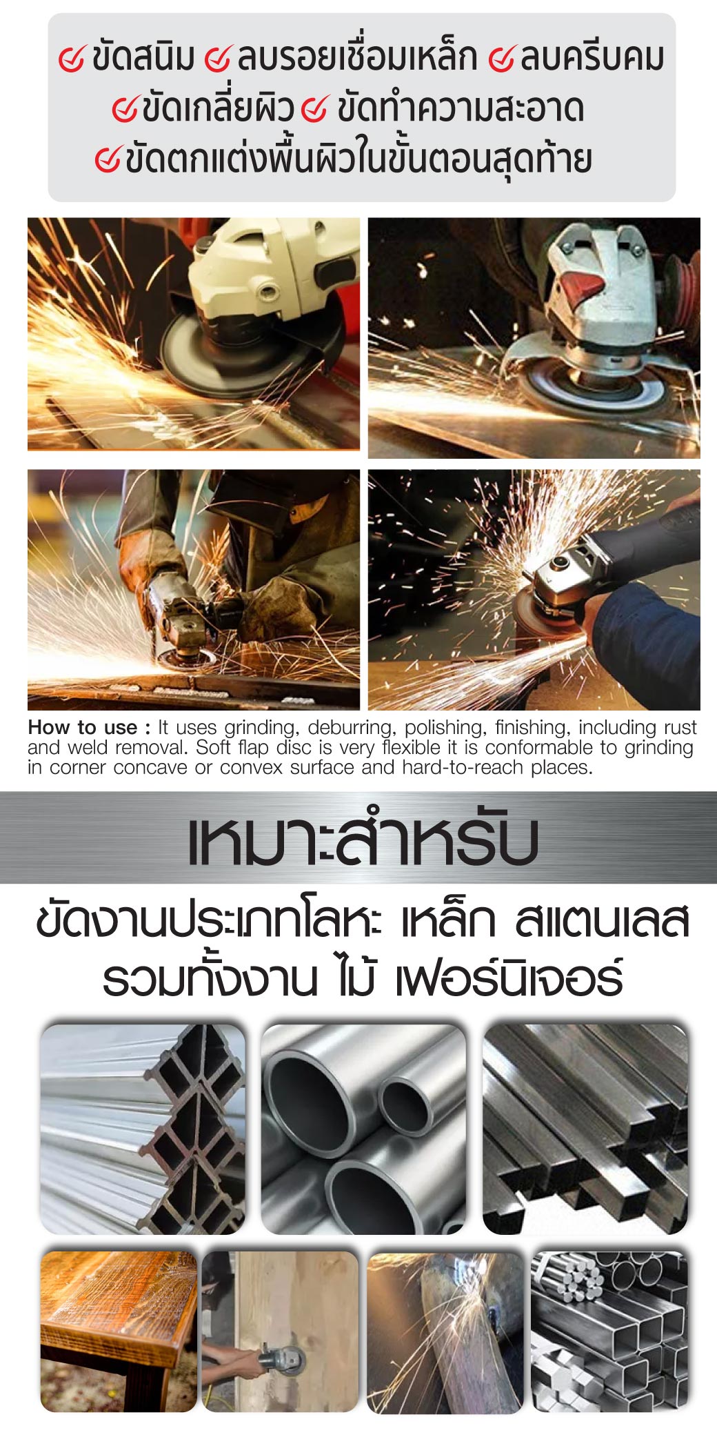 • ใช้ในงานเจียรเหล็ก ขัดสนิม ลบรอยเชื่อมเหล็ก ลบครีบคม ขัดเกลี่ยผิวขัดทำความสะอาด
