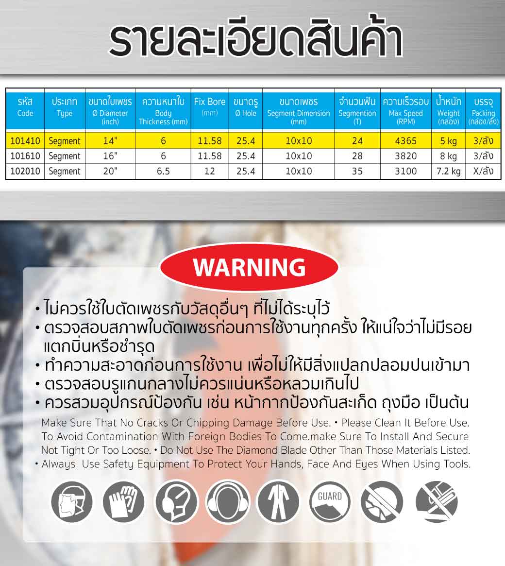 • ตรวจสอบสภาพใบตัดเพชรก่อนการใช้งานทุกครั้ง ให้แน่ใจว่าไม่มีรอยแตก บิ่น หรือชำรุด