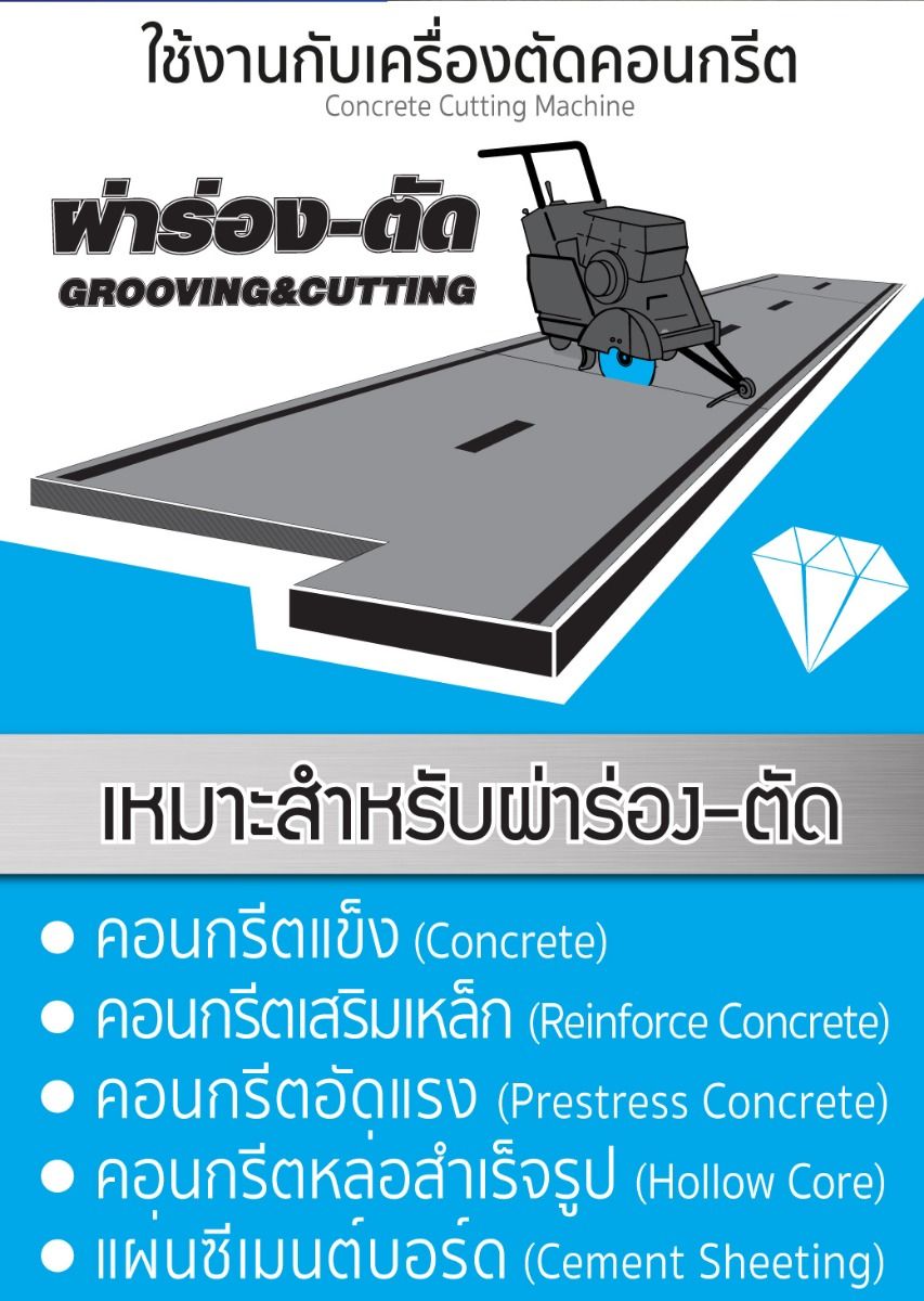 • ใช้สำหรับตัดคอนกรีตแข็ง, งานเซาะร่อง,ผ่าร่องหรือตัดถนน, คอนกรีตเสริมเหล็ก, คอนกรีตอัดแรง, คอนกรีตหล่อสำเร็จรูป, แผ่นซีเมนต์บอร์ด, แอสฟิลท์เพื่อหยอดยางมะตอย, ใช้กับรถตัดถนนสามารถตัดถนนที่เทไปหลายเดือน