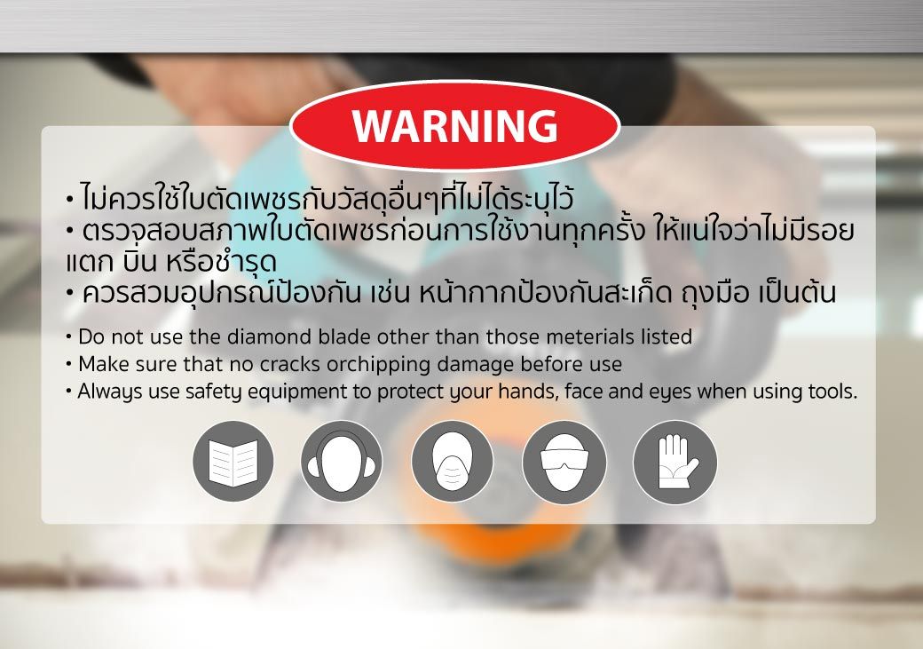 • ตรวจสอบสภาพใบตัดเพชรก่อนการใช้งานทุกครั้ง ให้แน่ใจว่าไม่มีรอยแตก บิ่น หรือชำรุด