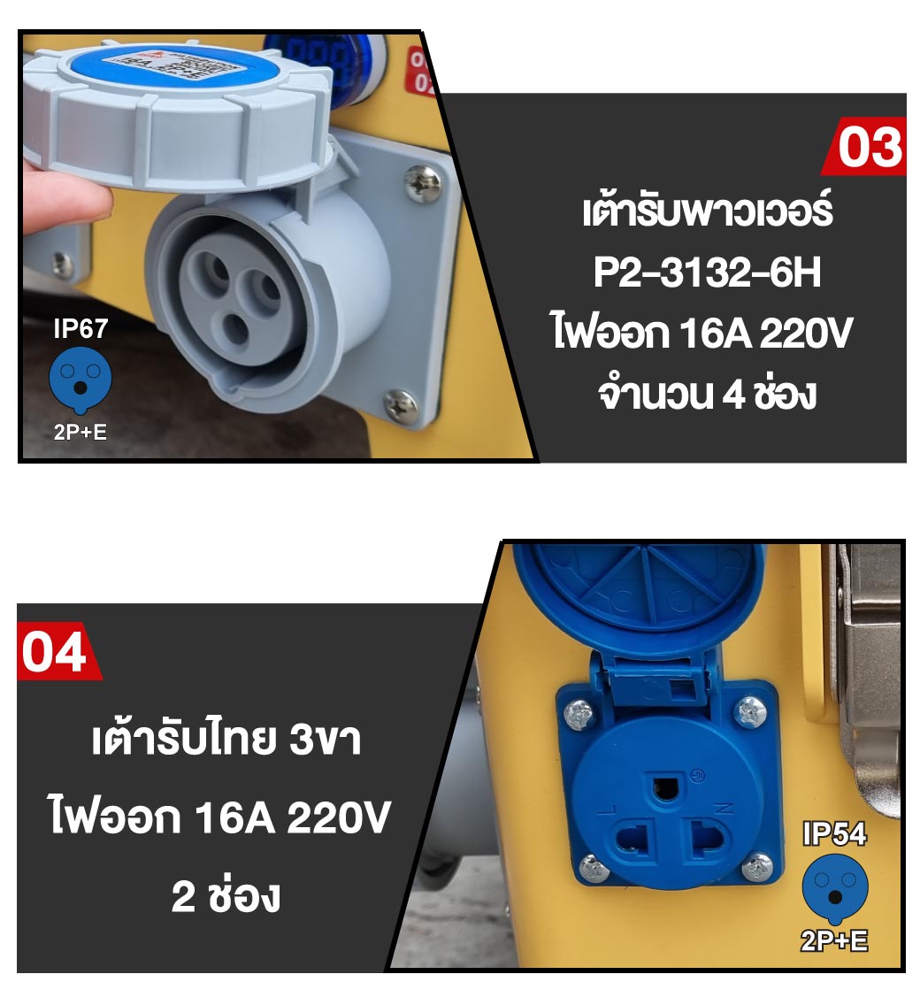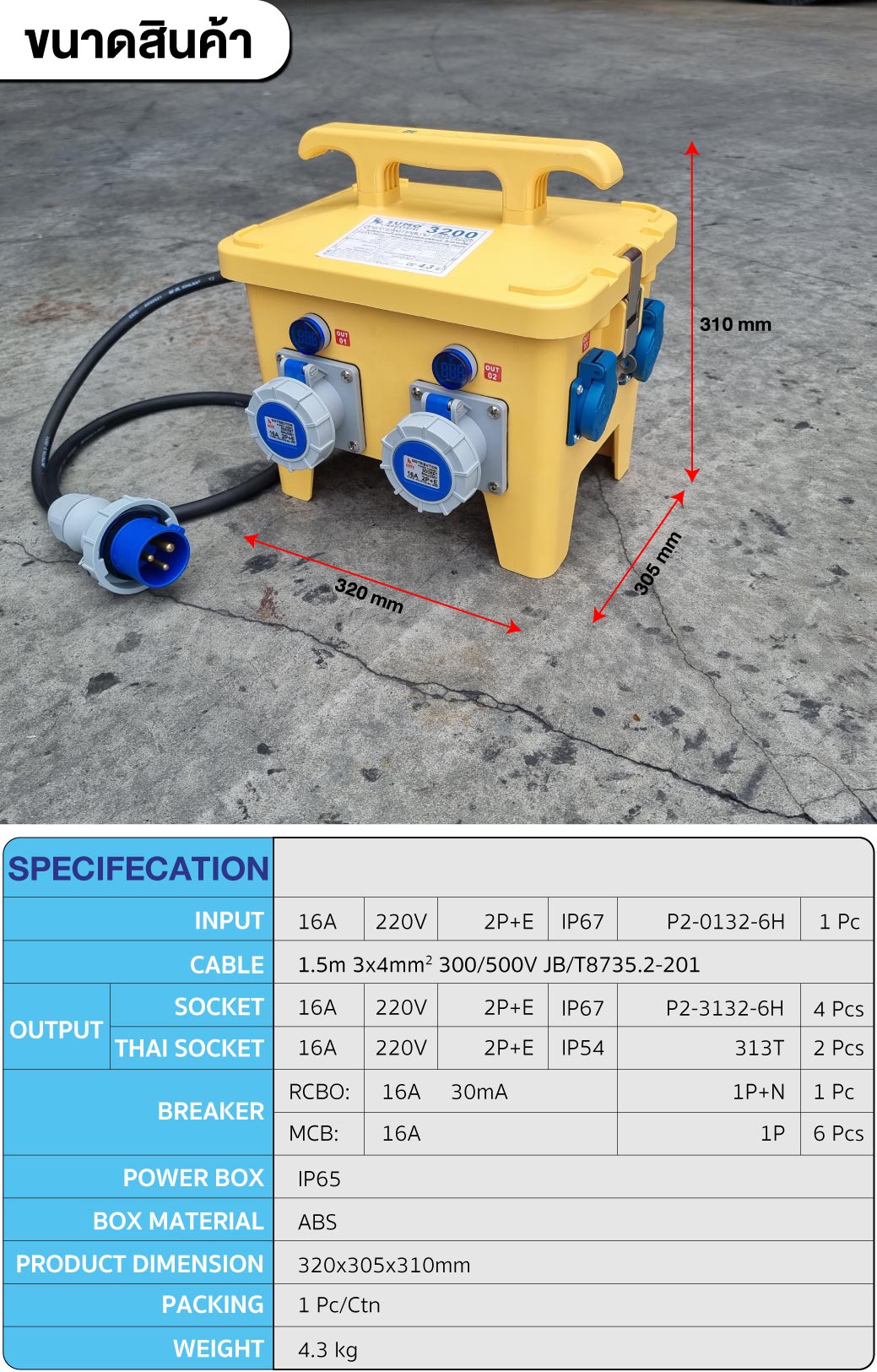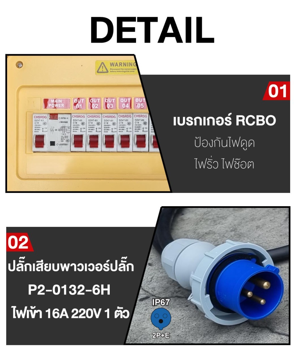 ตู้กระจายไฟภาคสนาม เบรกเกอร์เซฟตี้คัท RCBO 16A ไฟเข้า : 16A 220V เต้าพาวเวอร์ : 16A 220V 4 ช่อง เต้าไทย : 16A 220V 2 ช่อง