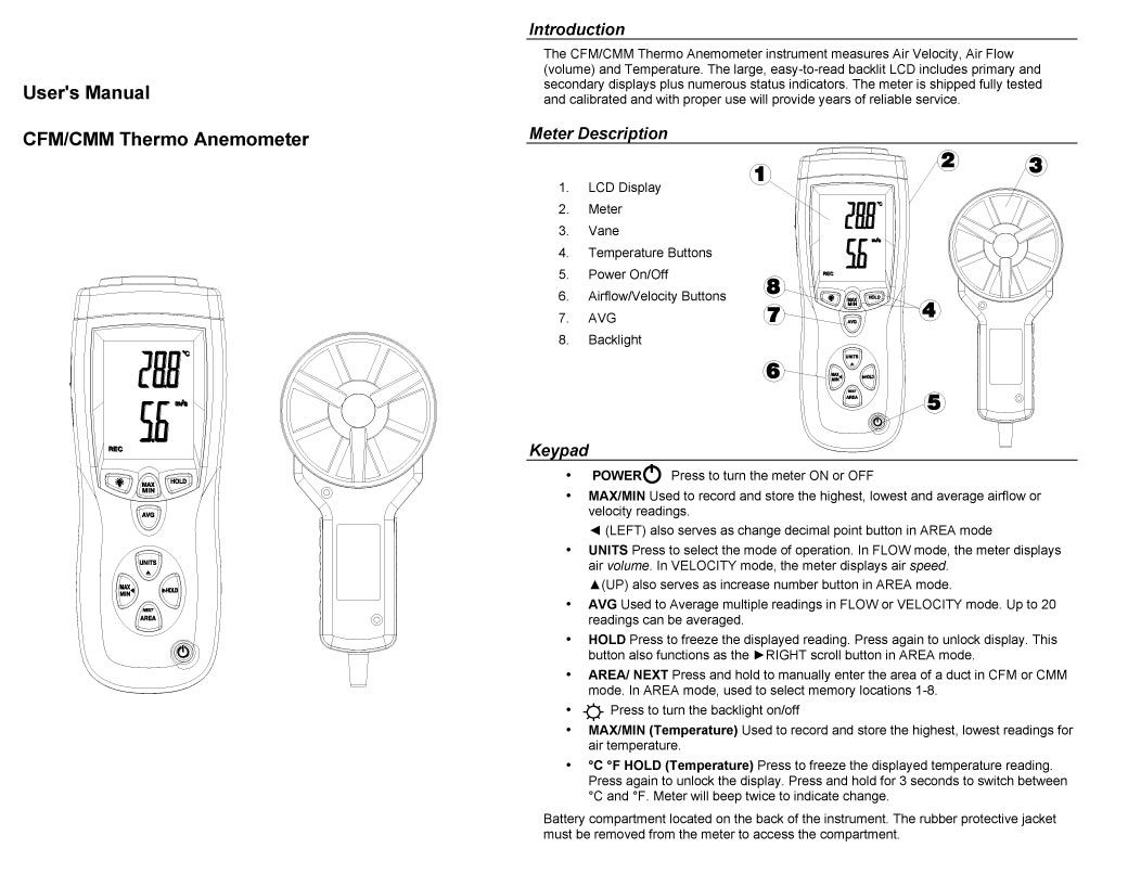 • CFM/CMM Thermo-Anemometer with built-in non-contact IR Thermometer measure remote surface temperature to 500ºC (932ºF) and 30:1 distance to spot ratio.