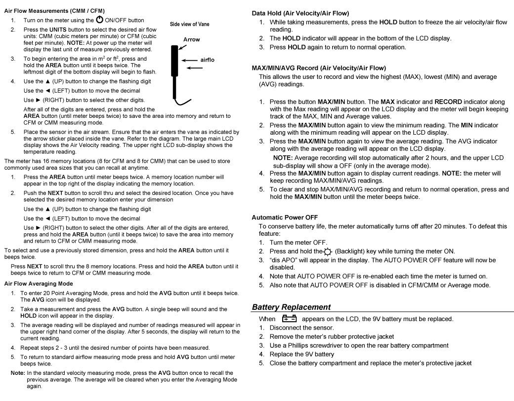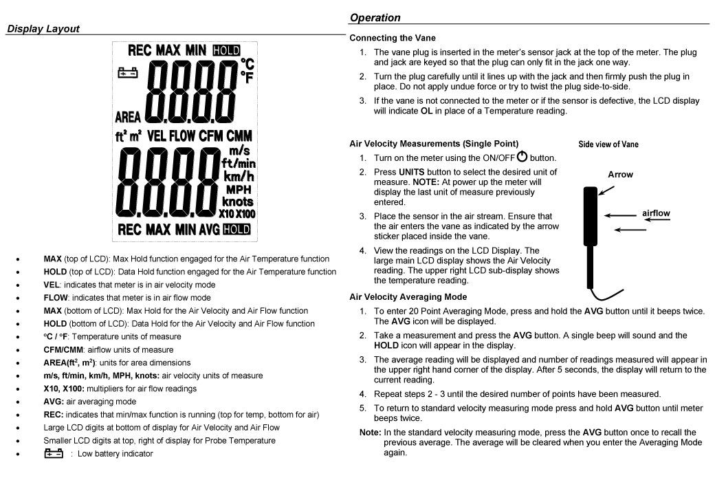 • - HOLD (bottom of LCD): Data Hold for the Air Velocity and Air Flow function