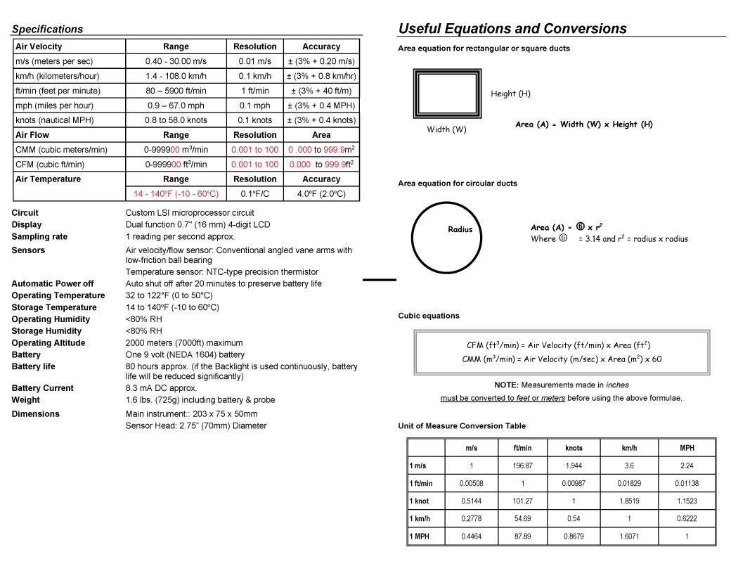 ใช้วัดความเร็วลมได้ตั้งแต่ 0.40~30.00 เมตร/วินาที หรือ 80~5900 ฟุต/นาที แม่นยำ ±3% ±0.20m/s