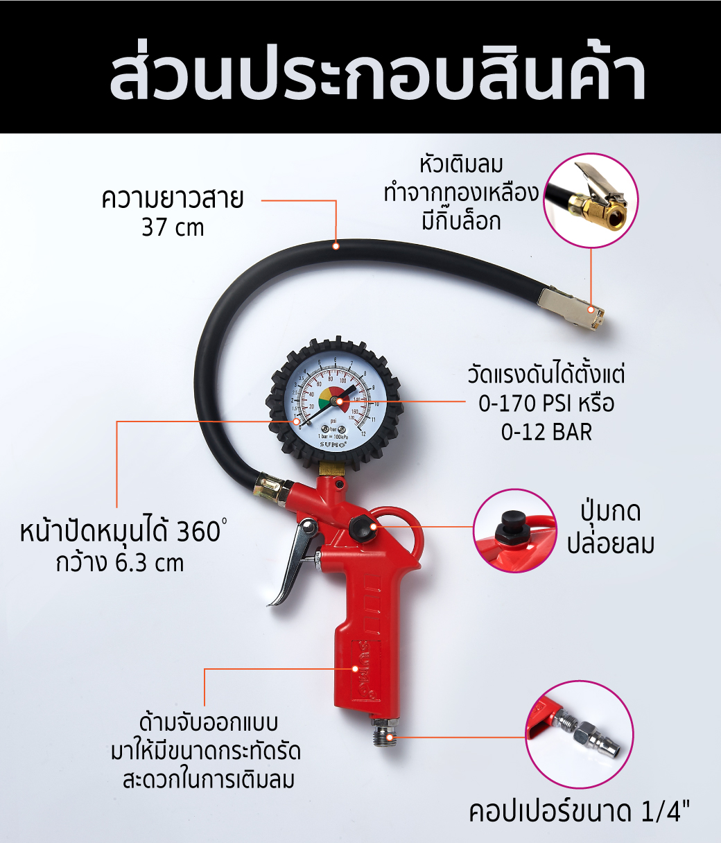 • เกจ์บอกระดับลม หมุนได้ 360 องศา ง่ายต่อการใช้งาน
