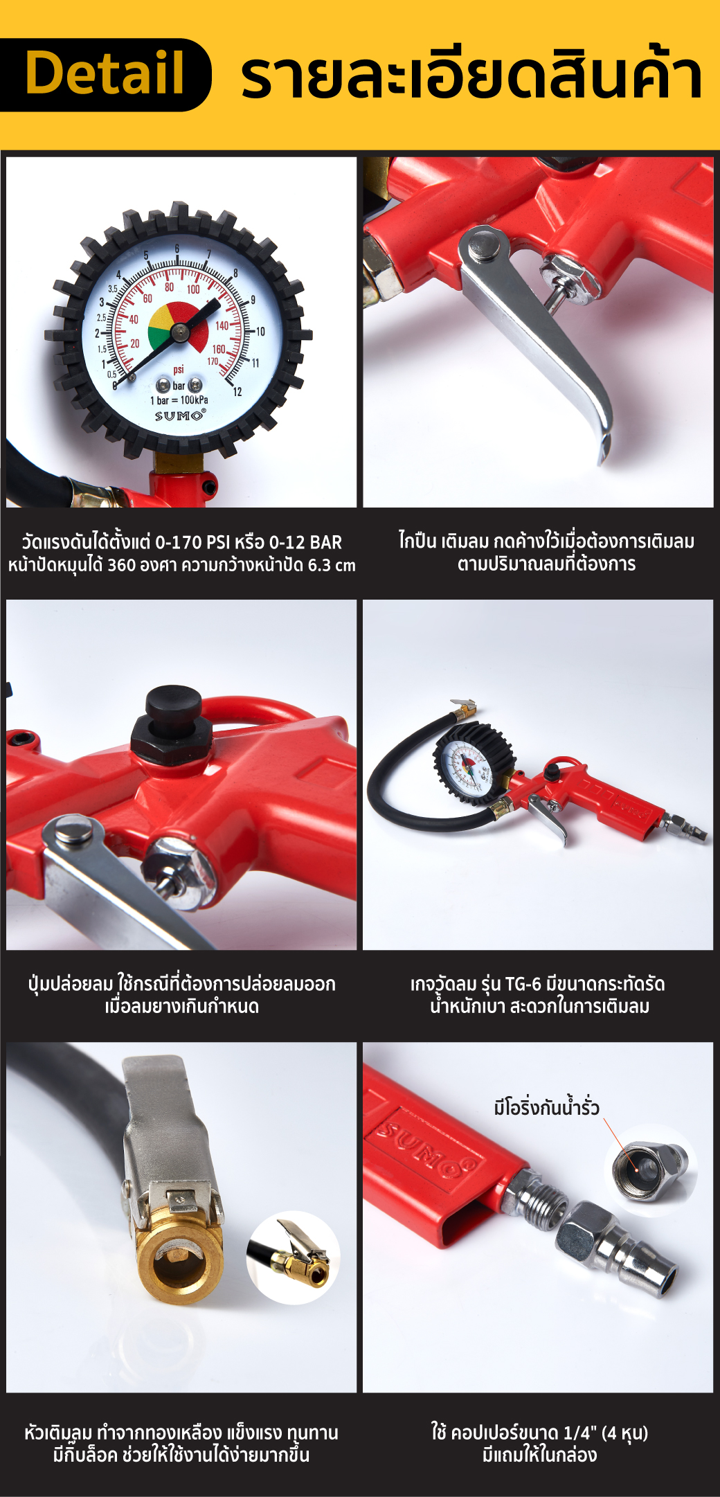 คุณกำลังรีวิว:เกจวัดลมพร้อมหัวเติมลม รุ่น TG-6 SUMO