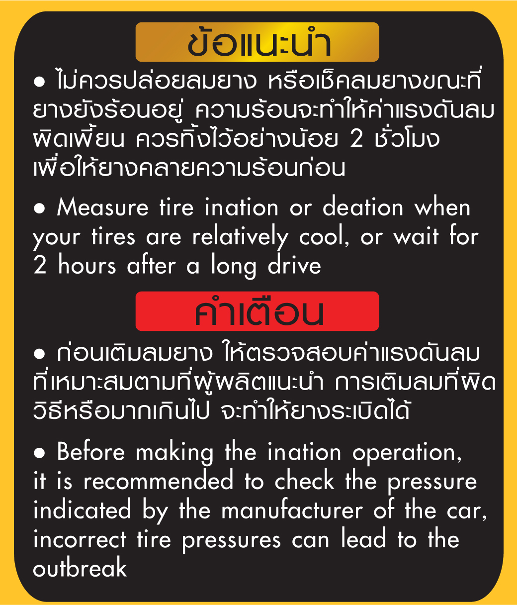 • ก่อนเติมลมยาง ให้ตรวจสอบค่าแรงดันลมที่เหมาะสมตามที่ผู้ผลิตแนะนำ การเติมลมที่ผิดวิธีหรือมากเกินไป จะทำให้ยางระเบิดได้