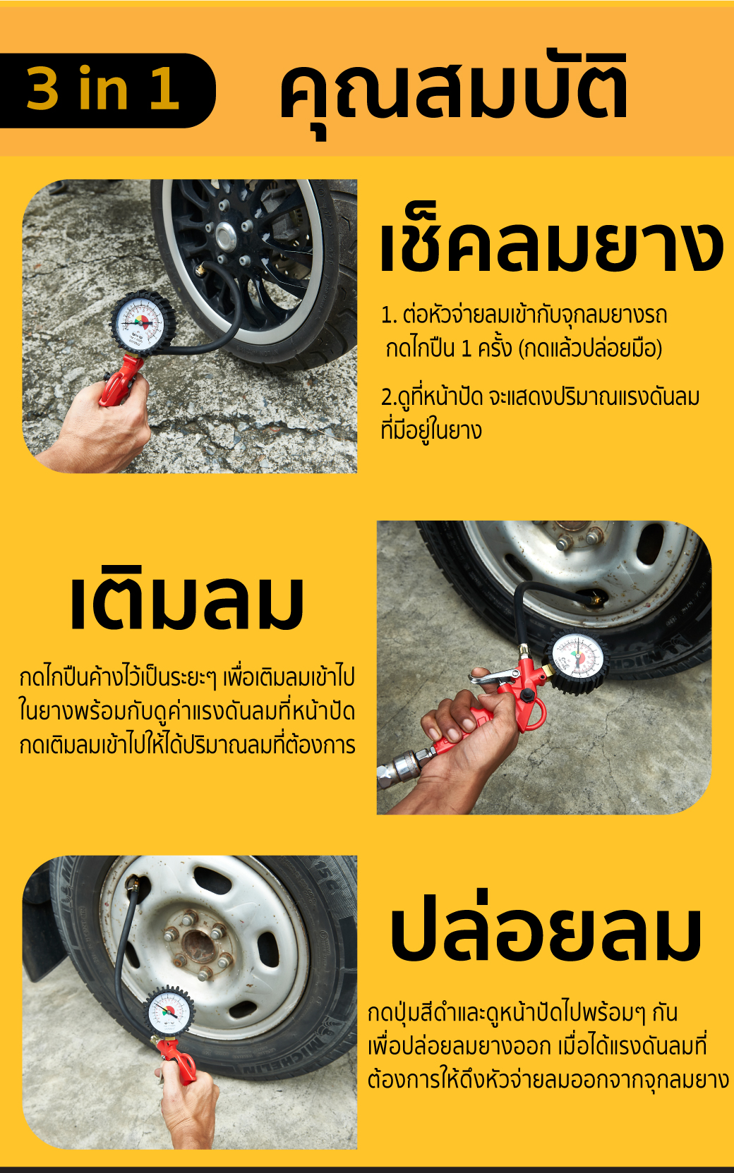 • ใช้งานได้ 3 IN 1 เติมลม ปล่อยลม เช็คลมยาง