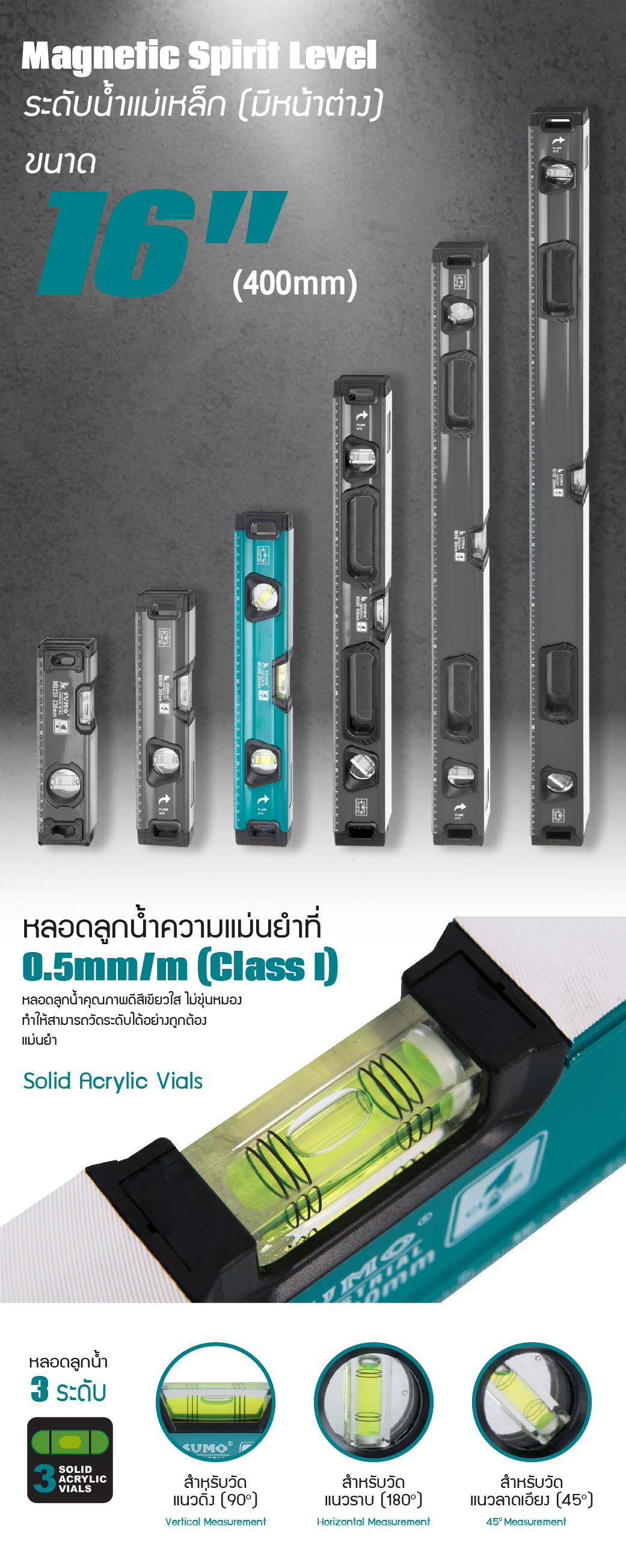 ระดับน้ำแม่เหล็ก 16 นิ้ว มีกำลังมากกว่าแม่เหล็กทั่วไปถึง 2 เท่า มีประสิทธิภาพในการยึดเกาะผิวที่เป็นเหล็กได้อย่างดี