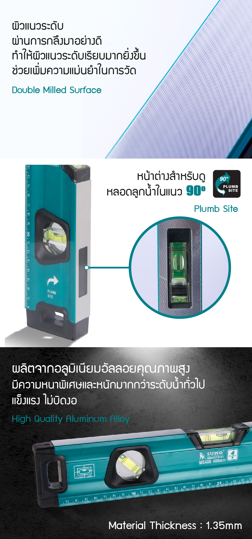 • หลอดลูกน้ำคุณภาพดีสีเขียวใส ไม่ขุ่นหมอง ทำให้สามารถวัดระดับได้อย่างถูกต้อง แม่นยำ