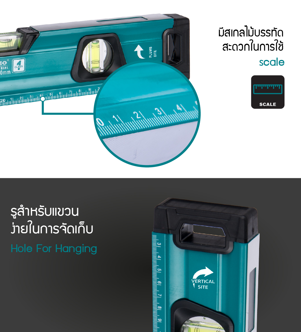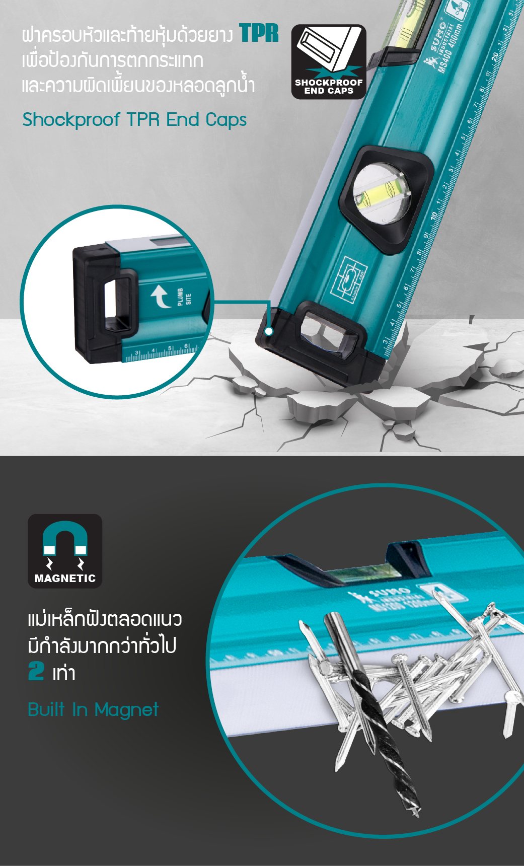 • แม่เหล็กผลิตจากอลูมิเนียมคุณภาพสูง มีความหนาพิเศษ และหนักมากกว่าระดับน้ำทั่วไป