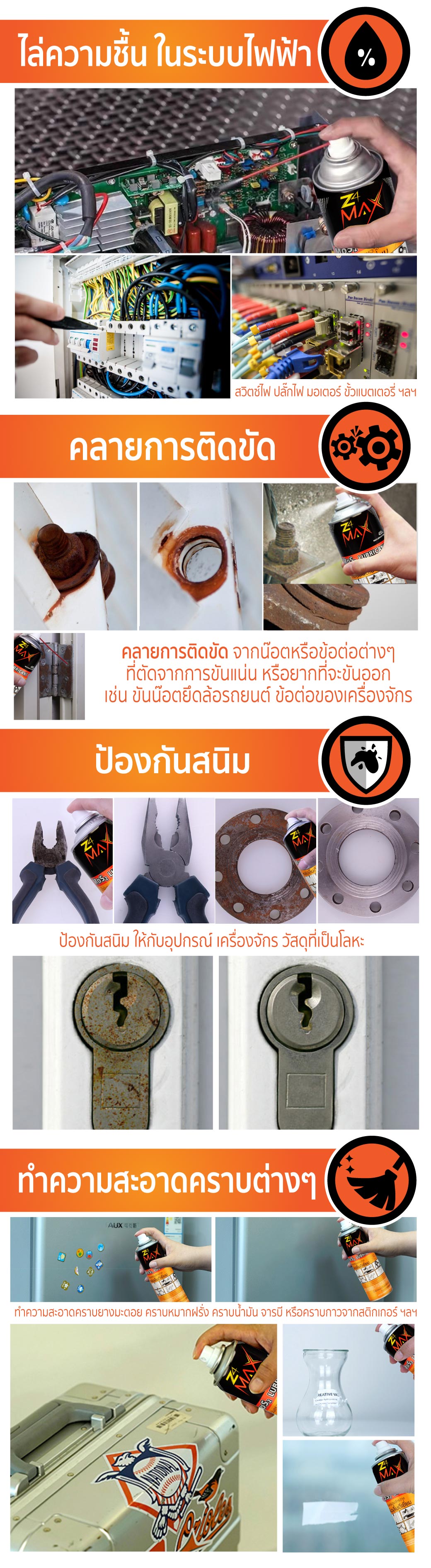 • หล่อลื่น ป้องกันความชื้น ป้องกันสนิม และทำความสะอาดป้องกันการกัดกร่อน ขจัดเสียงสายพานดัง คลายความติดขัดกัดสนิม
