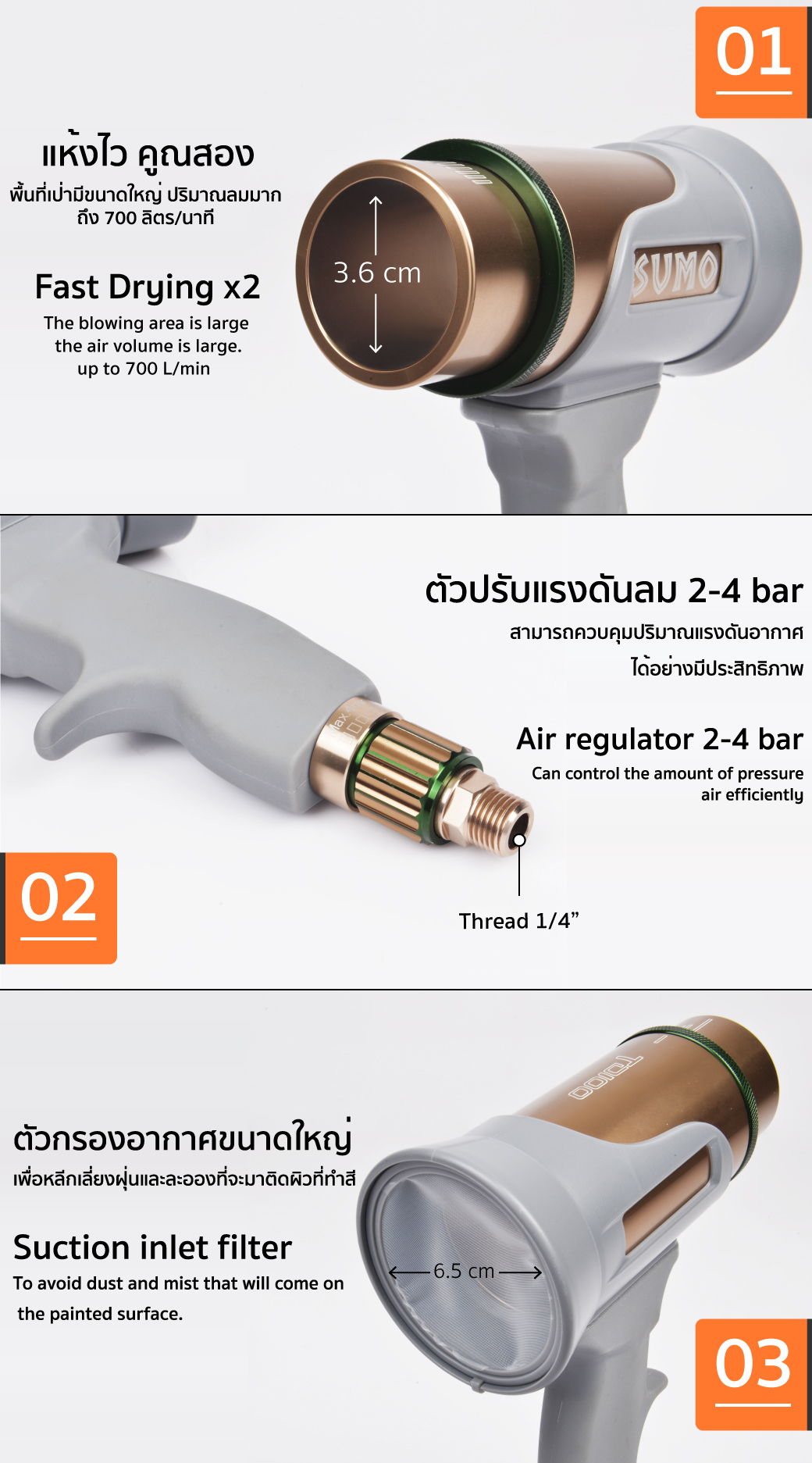 • เป่าแห้งไว คูณสอง พื้นที่เป่าขนาดใหญ่ ถึง 36 mm.