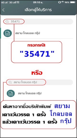 • ค้นหาผู้ให้บริการ โดยกรอกรหัส “35471” หรือพิมพ์คำว่า “สยาม โกลบอล กรุ๊ป”
