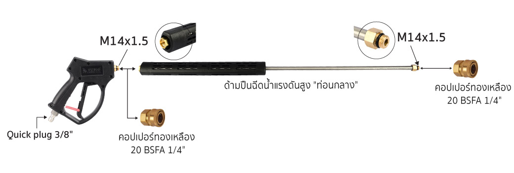• ขนาดหัวต่อเกลียว M14x1.5 ง่ายต่อการประยุกต์ใช้งานกับอุปกรณ์ทำความสะอาดชนิดอื่นๆ