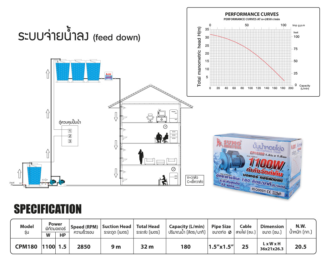 • ระยะส่ง (Total Head) : 32m