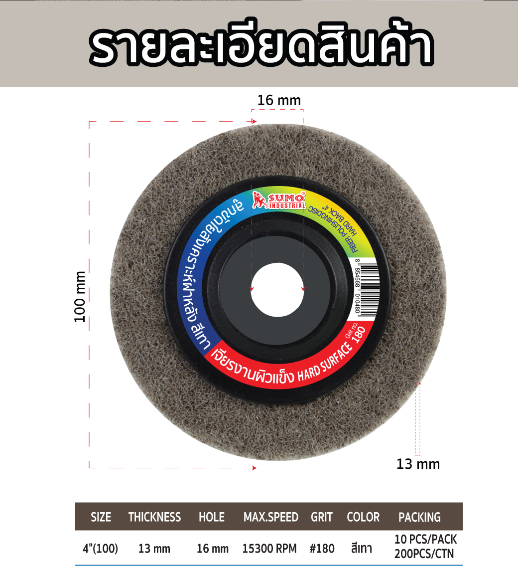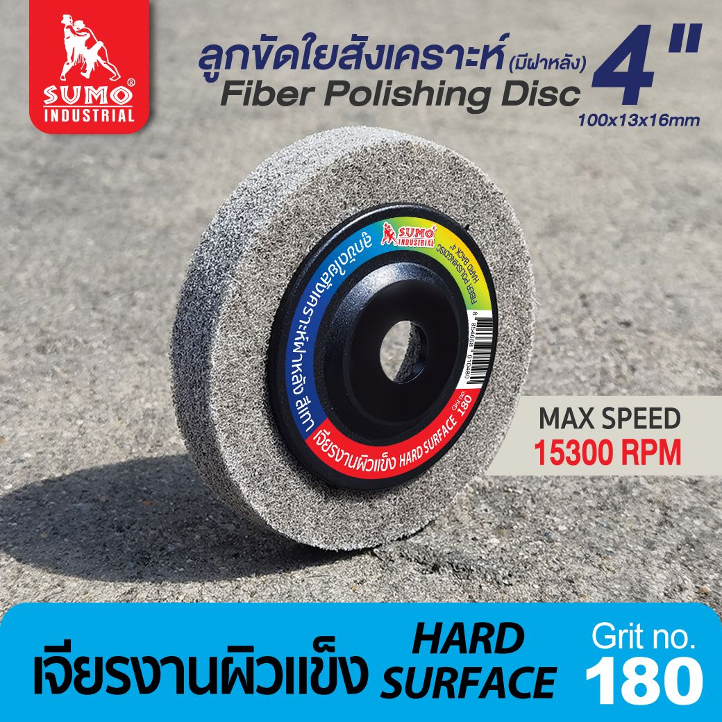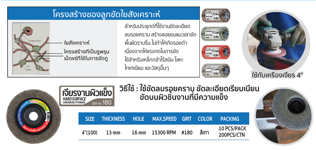 • ลูกขัดใยสังเคราะห์ฝาหลัง 4 นิ้ว เบอร์ 180 สีเทา งานผิวแข็ง งานชุบโครเมี่ยม ไทเทเนี่ยม