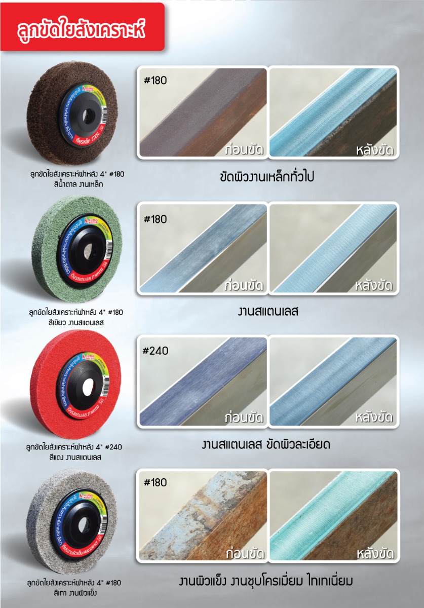 • เหมาะสำหรับ ใช้ขัดลบรอยคราบ ขัดละเอียดเรียบเนียน ขัดบนผิวชิ้นงานที่มีความแข็ง