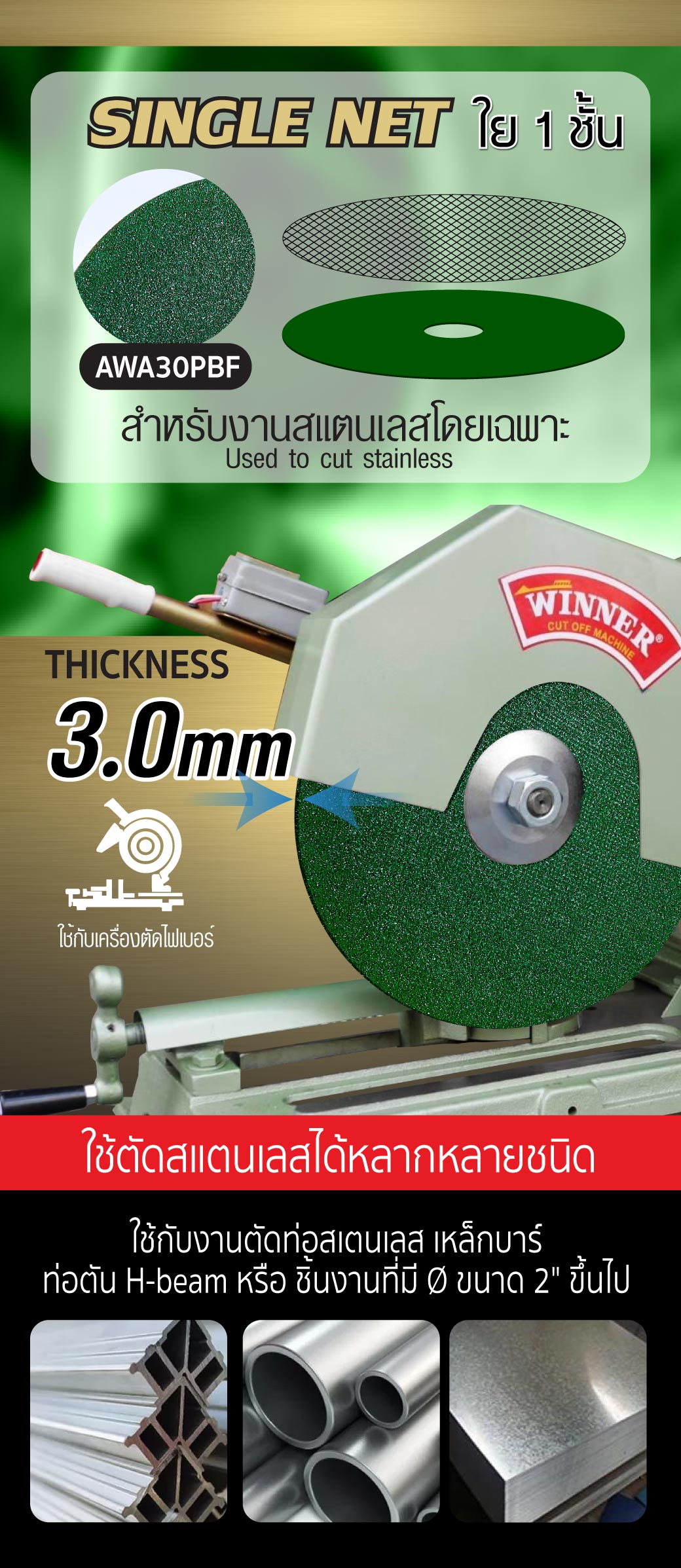 • ใช้สำหรับตัดสแตนเลสโดยเฉพาะ ชิ้นงานไร้รอยไหม้ ใบตัดคมกริบ ตัดคม ตัดเร็ว รอยตัดเนียนสวย ใช้กับงานตัดท่อสเตนเลส เหล็กบาร์ ท่อตัน H-beam หรืองานที่มี Ø ขนาด 2" ขึ้นไป