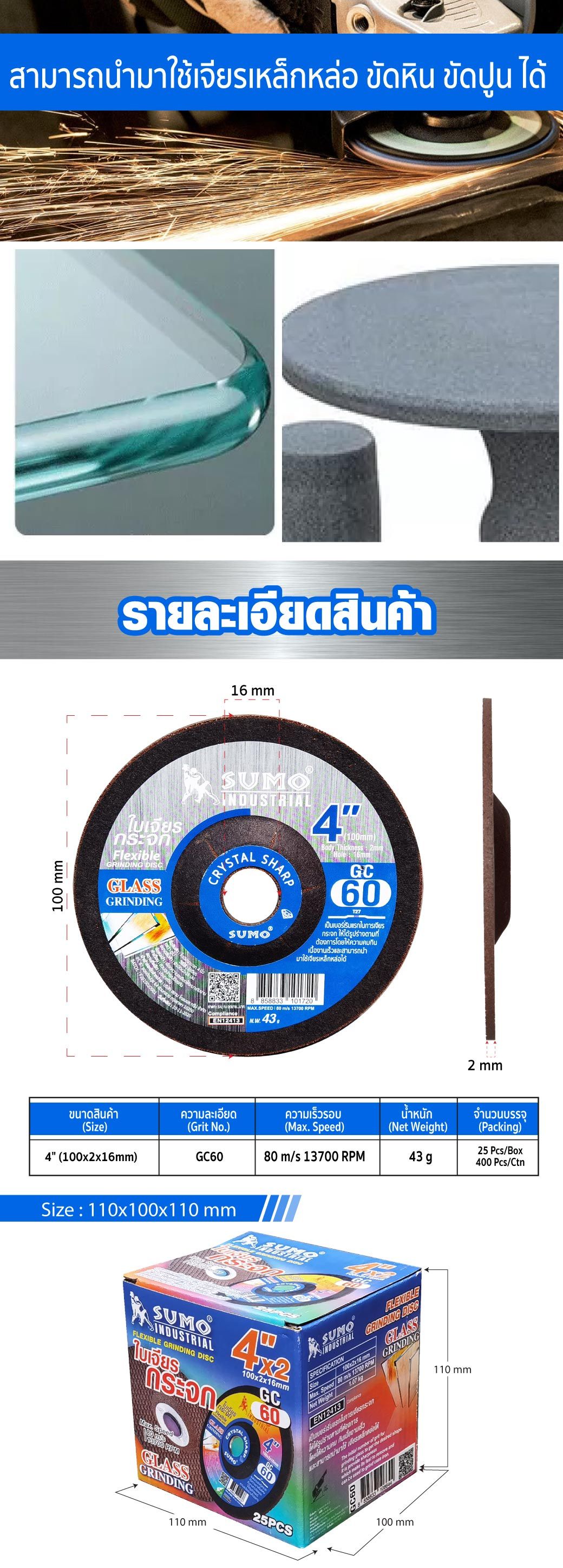 คุณกำลังรีวิว:ใบเจียรกระจก 4” (บาง) 100x2mm. GC60 SUMO