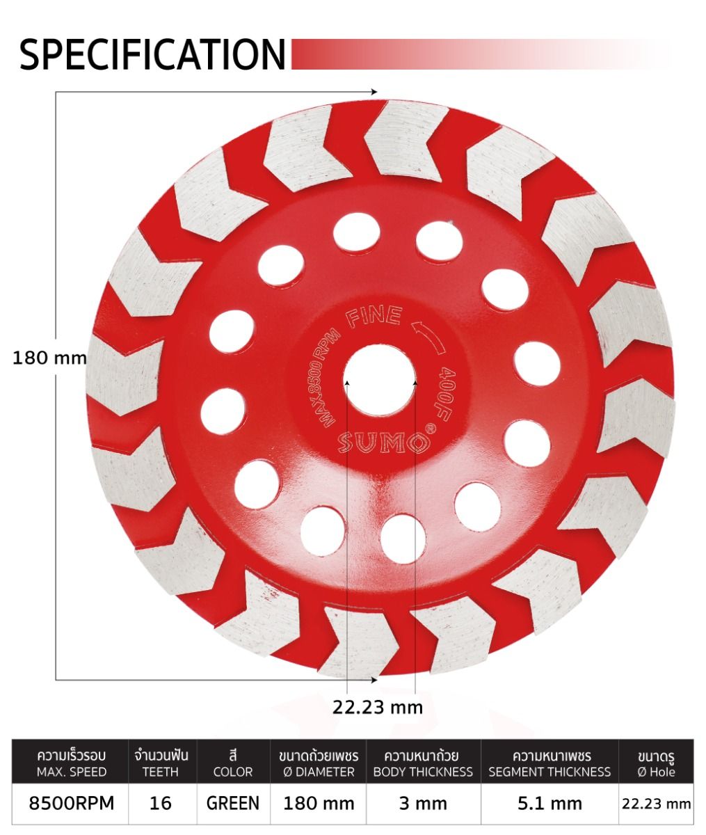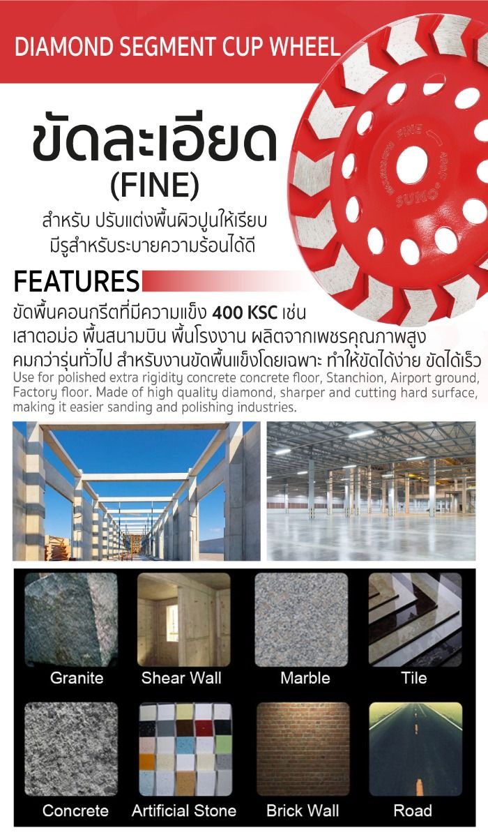 • ผลิตจากเพชรคุณภาพสูง คมกว่าทั่วไป สำหรับงานขัดพื้นแข็งโดยเฉพาะทำให้ขัดได้ง่าย ขัดได้เร็ว
