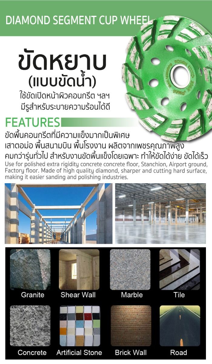 • ผลิตจากเพชรคุณภาพสูง คมกว่าทั่วไป สำหรับงานขัดพื้นแข็งโดยเฉพาะทำให้ขัดได้ง่าย ขัดได้เร็ว