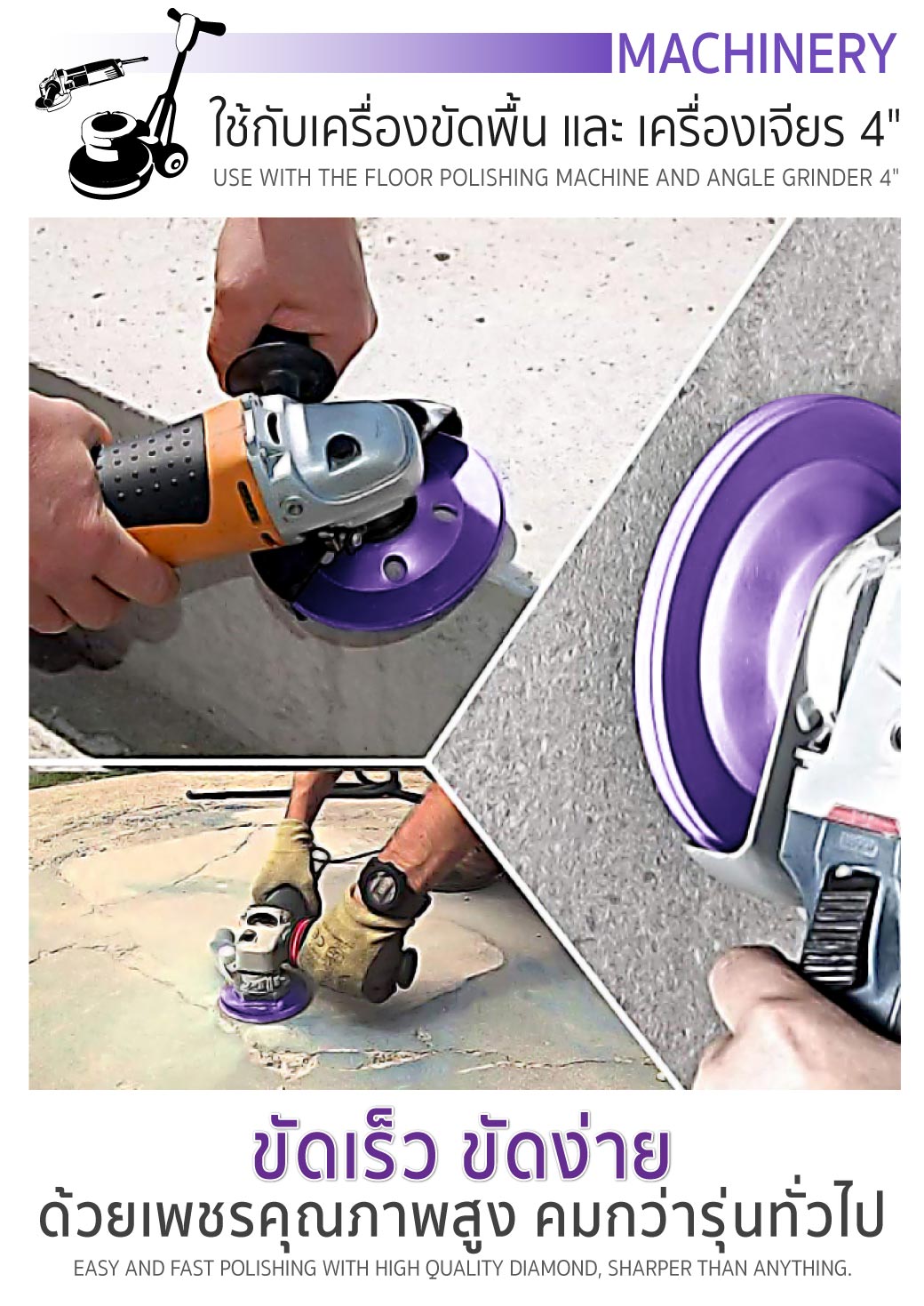 • ใช้กับเครื่องขัดพื้นและเครื่องเจียร 4"