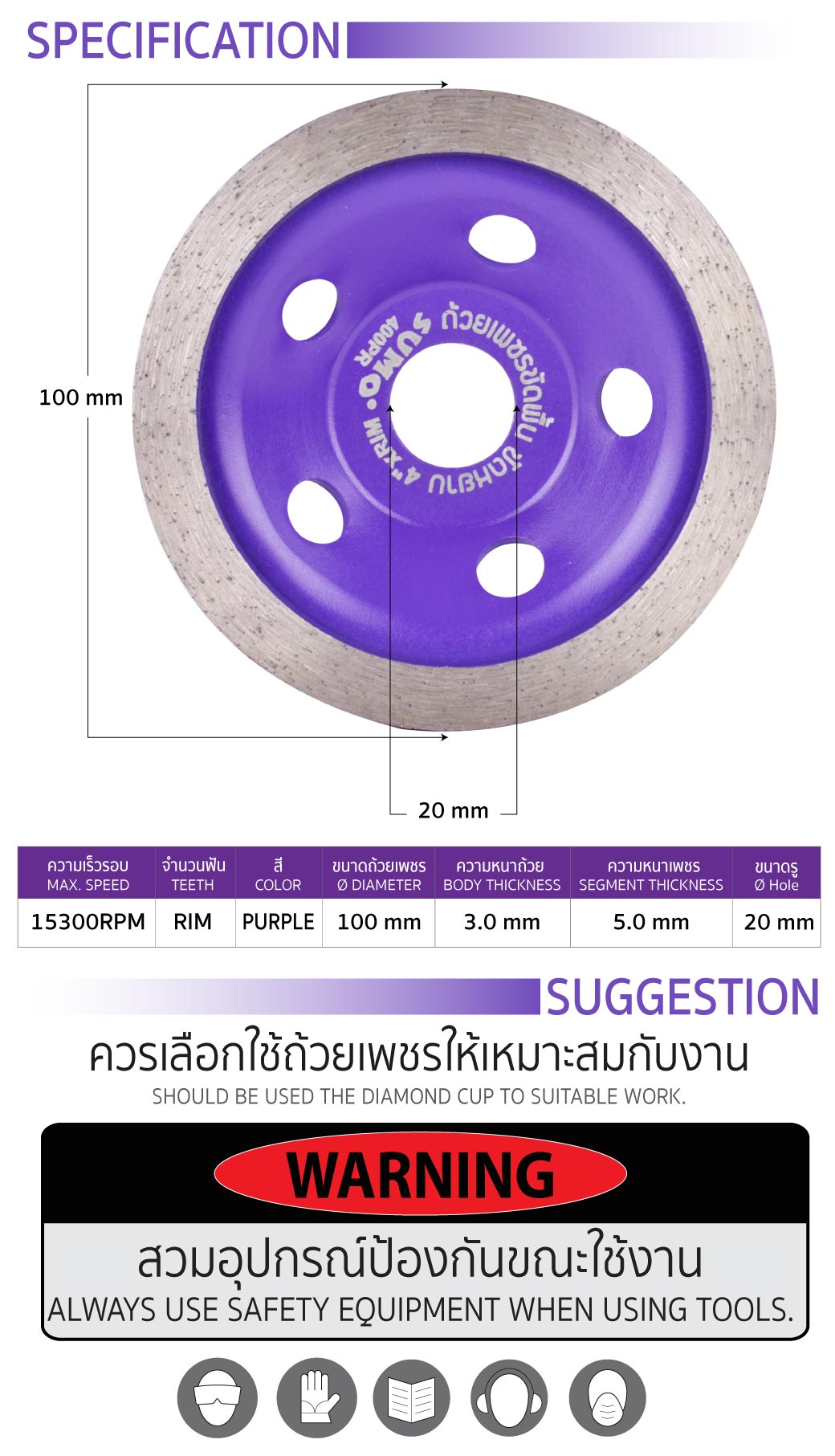 • ขนาดถ้วยเพชร  : 100mm
