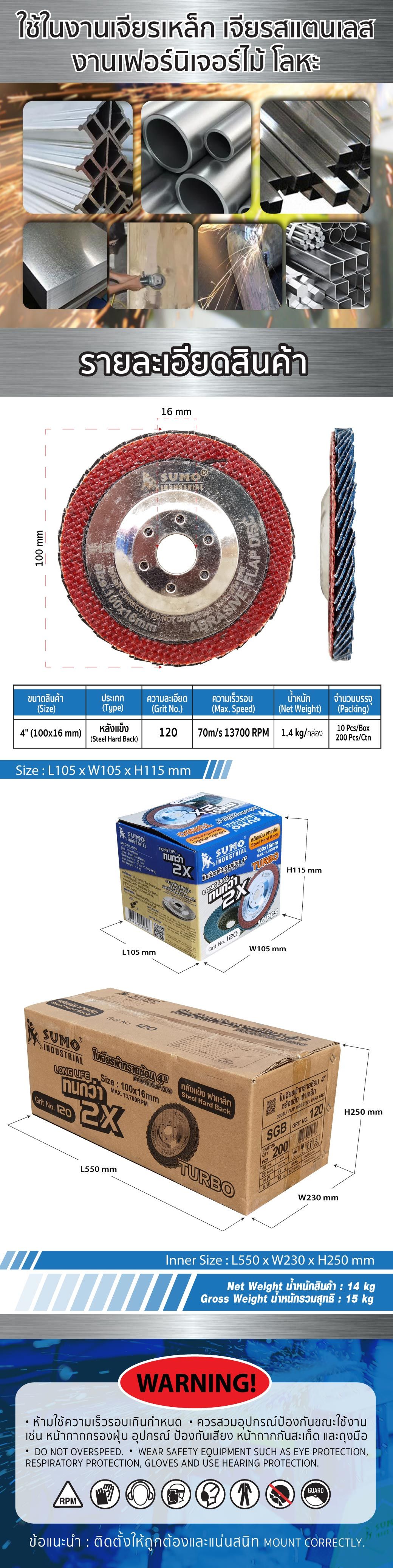 ใบเจียรผ้าทรายซ้อน 4" No.120 หลังแข็ง Turbo ฝาเหล็ก SUMO