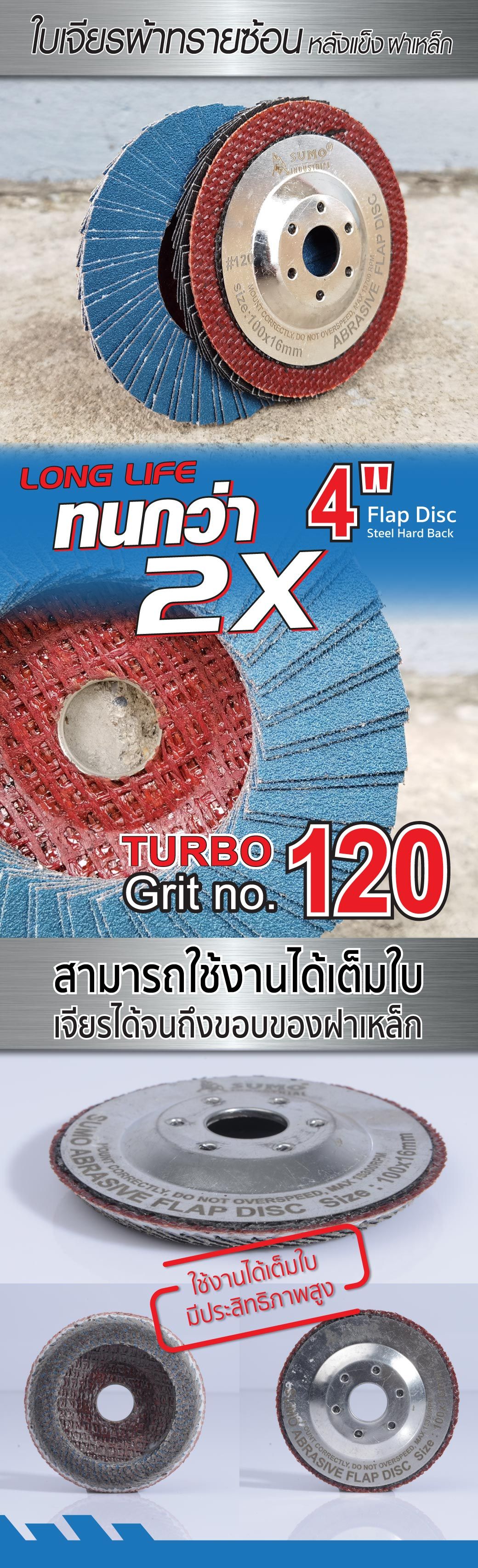 คุณกำลังรีวิว:ใบเจียรผ้าทรายซ้อน 4" No.120 หลังแข็ง Turbo ฝาเหล็ก