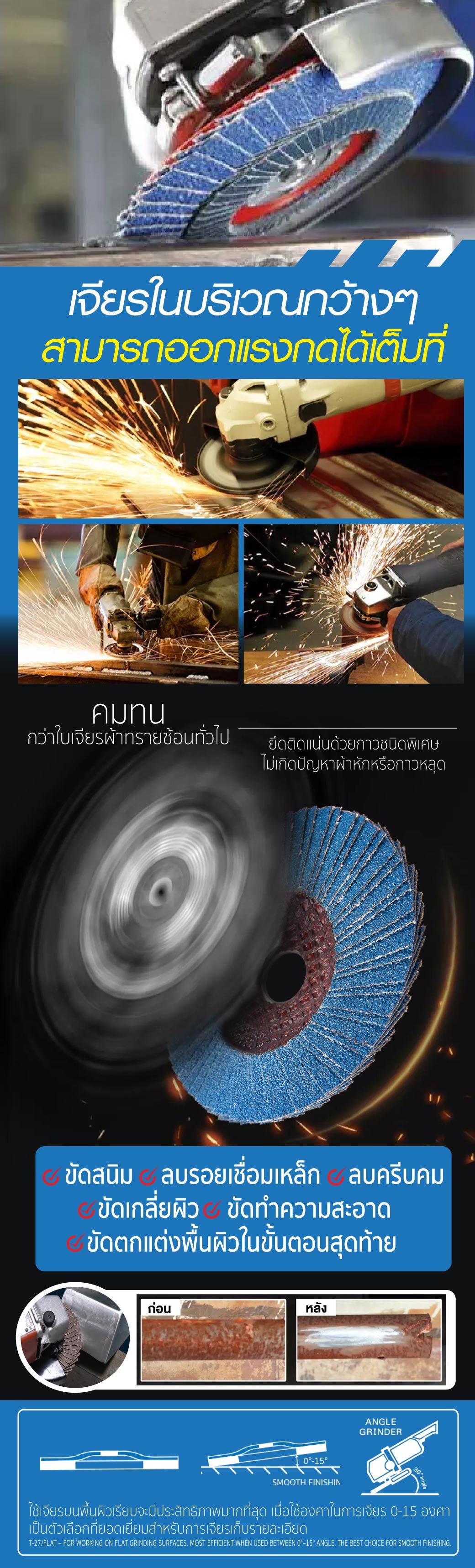 • ใช้ในงานเจียรเหล็ก เจียรสแตนเลส งานเฟอร์นิเจอร์ไม้ โลหะ ขัดสนิม ลบรอยเชื่อมเหล็ก ลบครีมคม ขัดเกลี่ยผิว