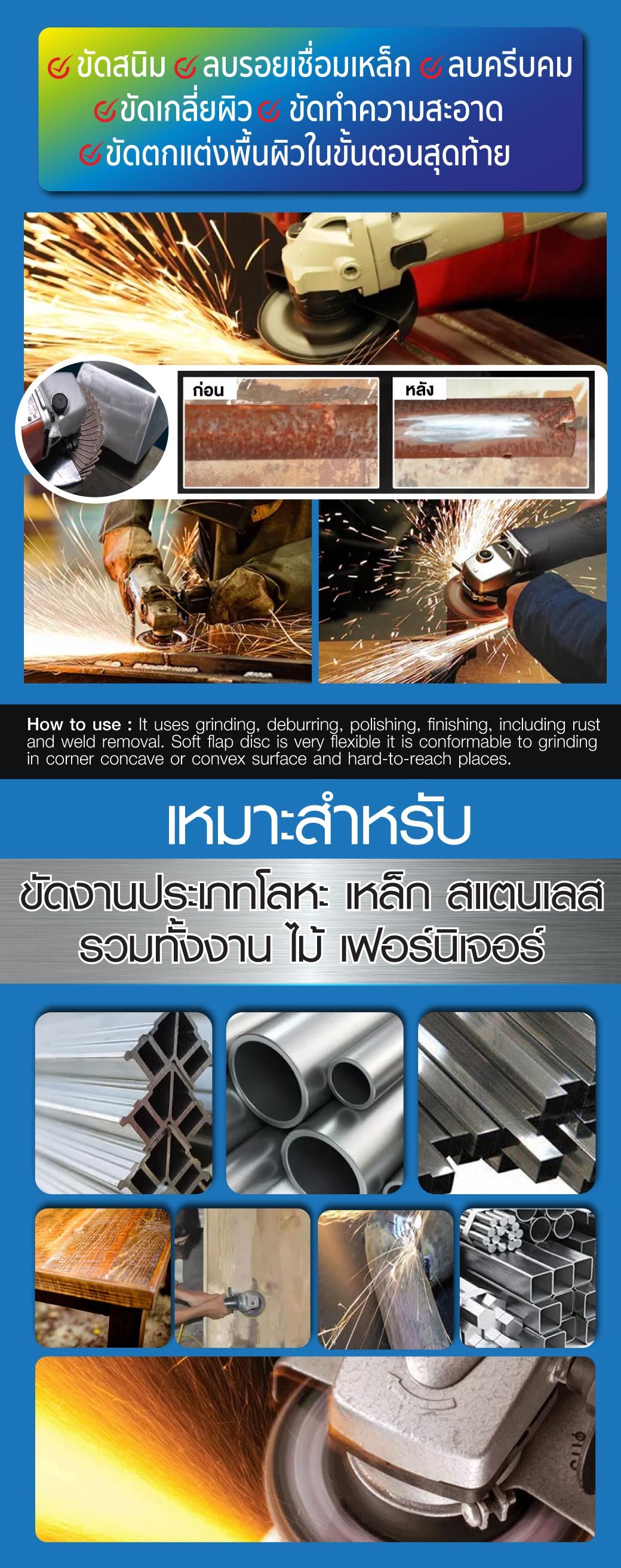 • ใช้ในงานเจียรเหล็ก ขัดสนิม ลบรอยเชื่อมเหล็ก ลบครีบคม ขัดเกลี่ยผิว ขัดทำความสะอาดและขัดตกแต่งพื้นผิวในขั้นตอนสุดท้าย