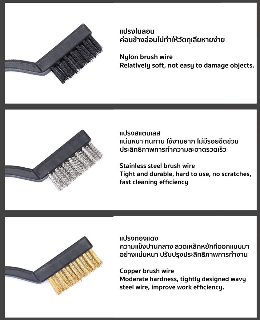 • แปรง 3 ชิ้น ขนแปรงทำจากวัสดุที่แตกต่างกันสามชนิด สเตนเลส/ไนลอน/ทองเหลือง วัสดุที่แตกต่างกัน การใช้งานที่แตกต่างกัน