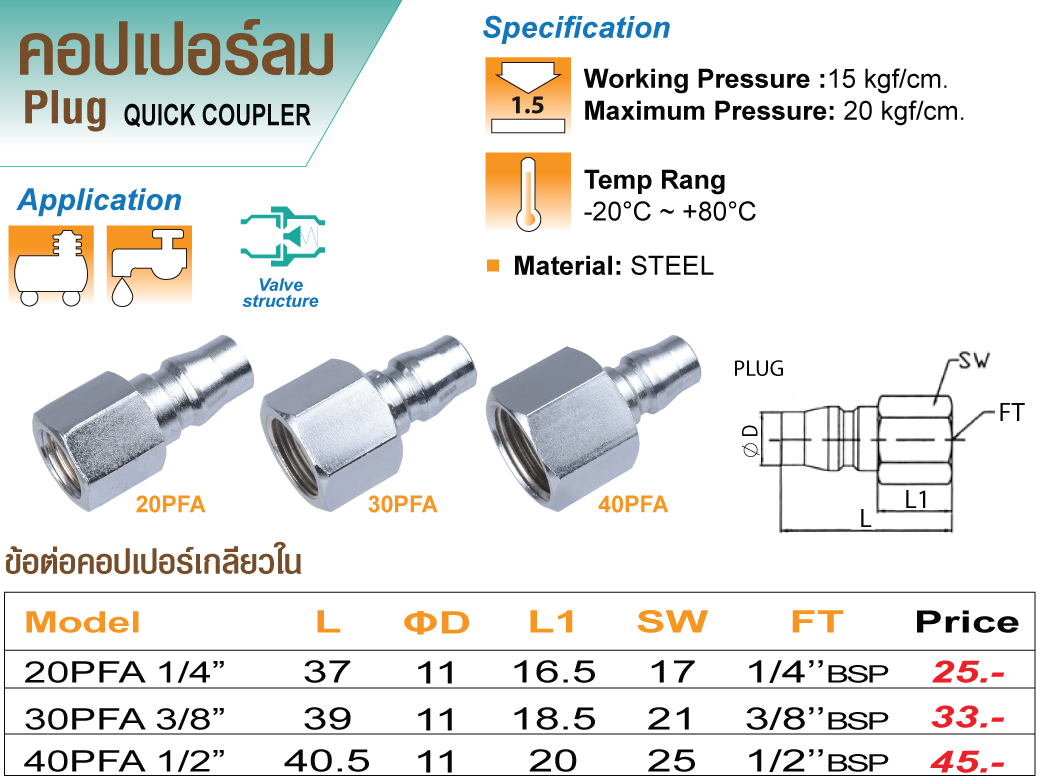 • แรงดันขณะใช้งาน : 15 kgf/cm.