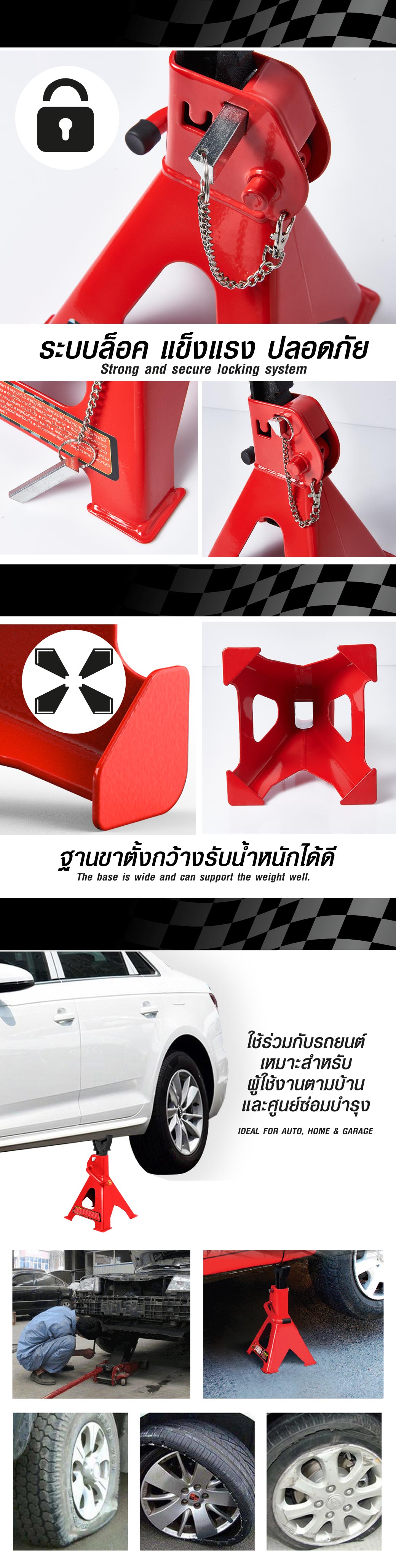 • ใช้คู่กับแม่แรงเพื่อป้องกันอันตรายจากการทำงานผิดพลาดของแม่แรง ขณะซ่อมบำรุงรถยนต์หรือเครื่องจักร