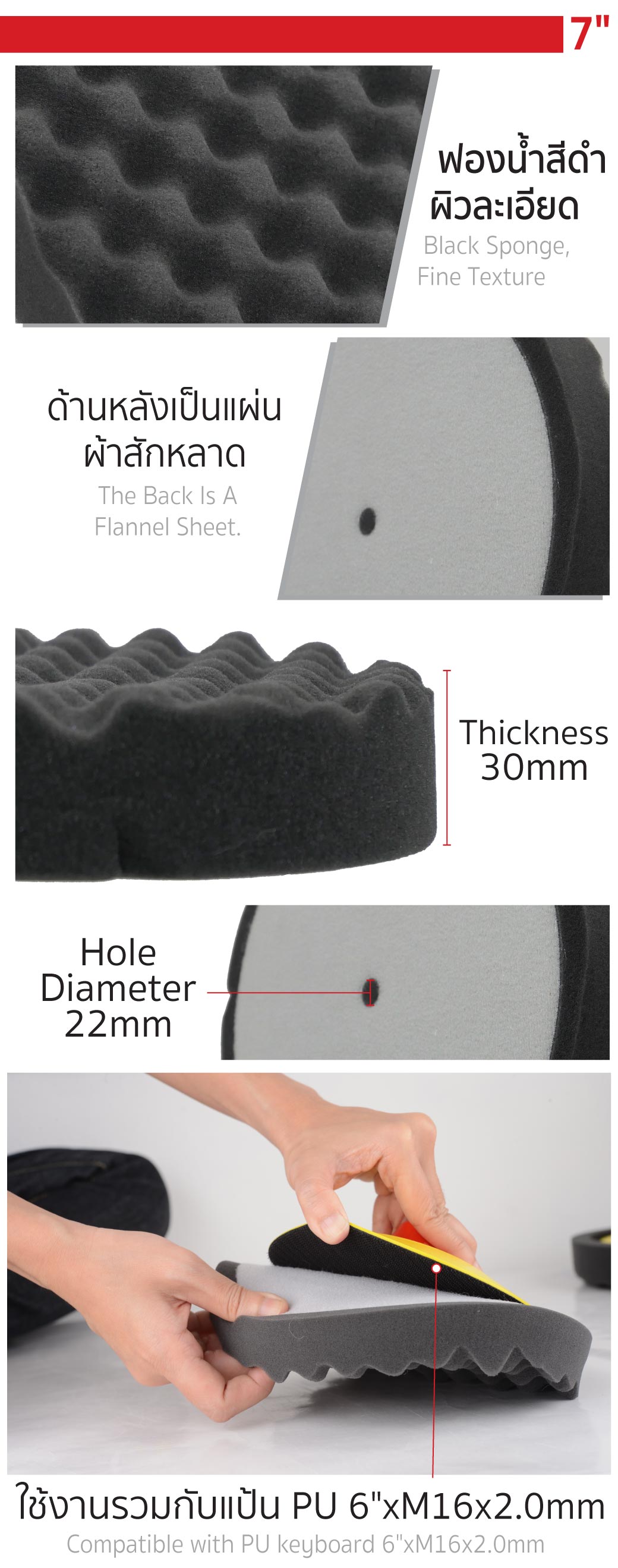 • ฟองน้ำสีดำผิวละเอียด ด้านหลังเป็นแผ่นผ้าสักหลาด