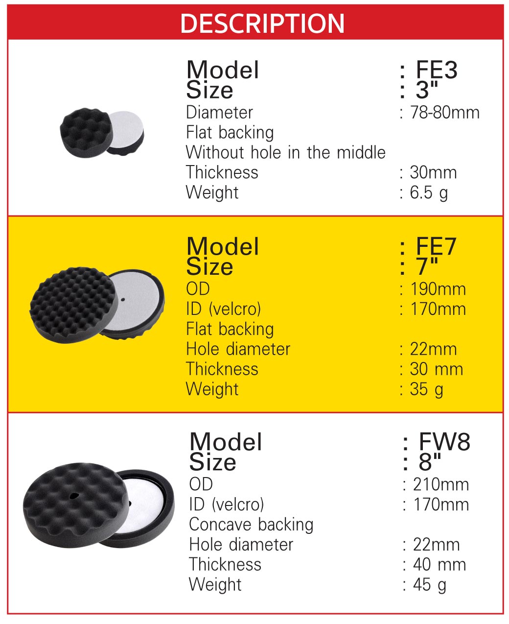 • ทำจากฟองน้ำของเยอรมันที่มีความละเอียด ฟองน้ำสีดำผิวละเอียด ด้านหลังเป็นแผ่นผ้าสักหลาด สามารถลบรอยขัดแกะให้ความเงางาม เหมือนกระจก ใช้สำหรับงานเก็บริ้วรอย รอยริ้วแสง ขจัดคราบสิ่งสกปรกต่างๆ งานลงแว็กซ์เก็บงานหรืองานเคลือบสีรถ พื้นหินอ่อน และพื้นผิวอื่นๆ ฟองน้ำเป็นทรงลูกฟูกช่วยระบายความร้อน ทำให้ขัดได้เรียบเนียนและช่วยยืดอายุการใช้งานเนื้อฟองน้ำมีความยืดหยุ่นสูง ทนทาน ไม่ฉีกขาดง่าย และไม่ทำให้เกิดรอยขนแมว