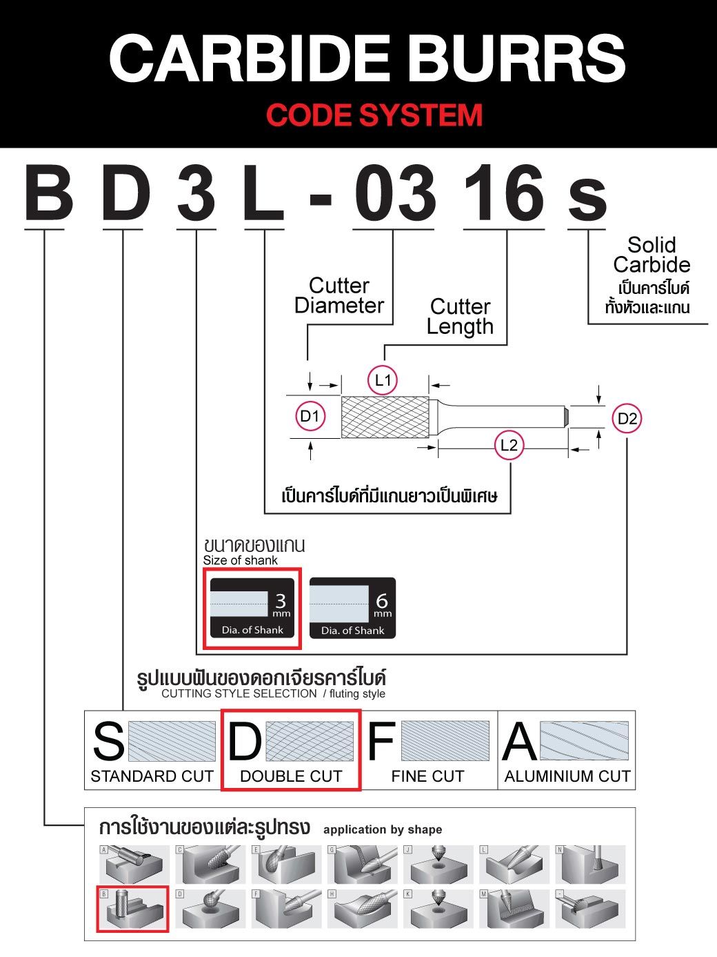 • เส้นผ่านศูนย์กลางของก้าน                      (D2) (Dia. of Shank)     :       6 mm.
