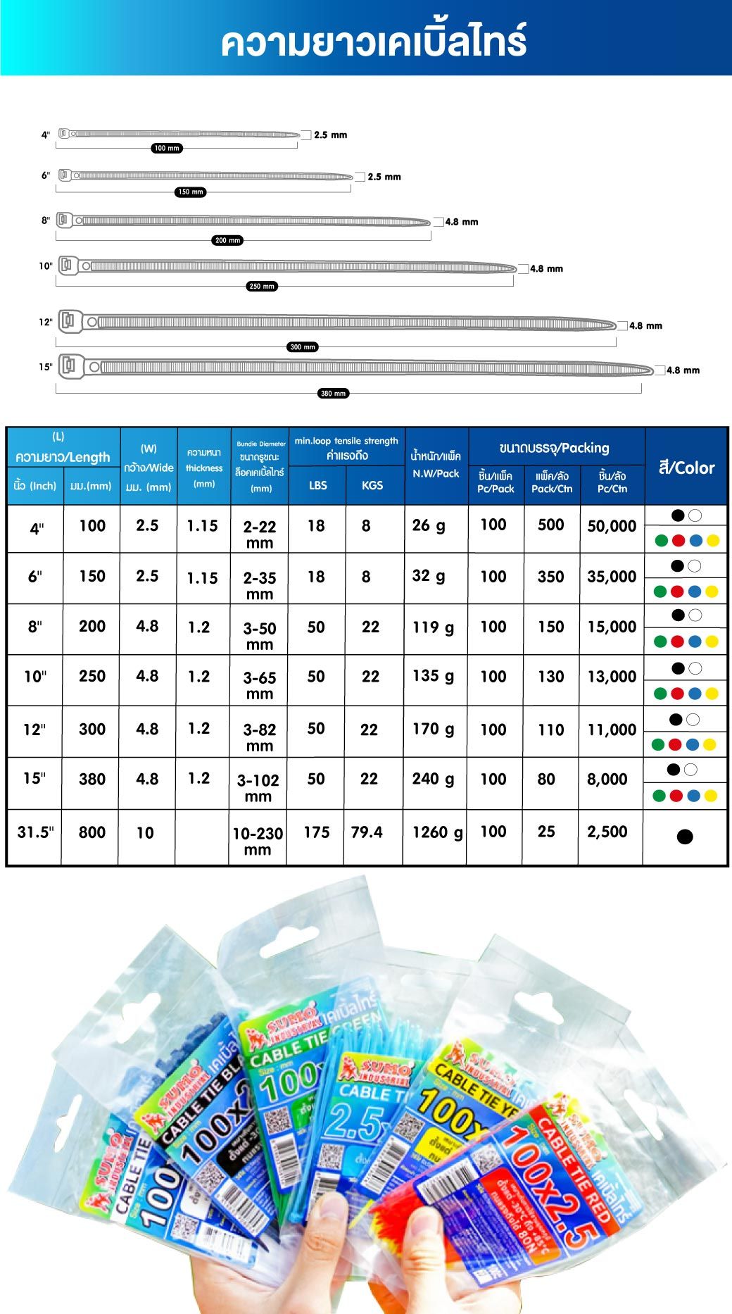 • ใช้งานประเภทต่างๆ เช่น รัดสายไฟ สายแลน (LAN) รัดท่อ สายโทรศัพท์ สายสัญญาณ รัดปากถุงปุ๋ย คล้องแถบป้ายโฆษณา