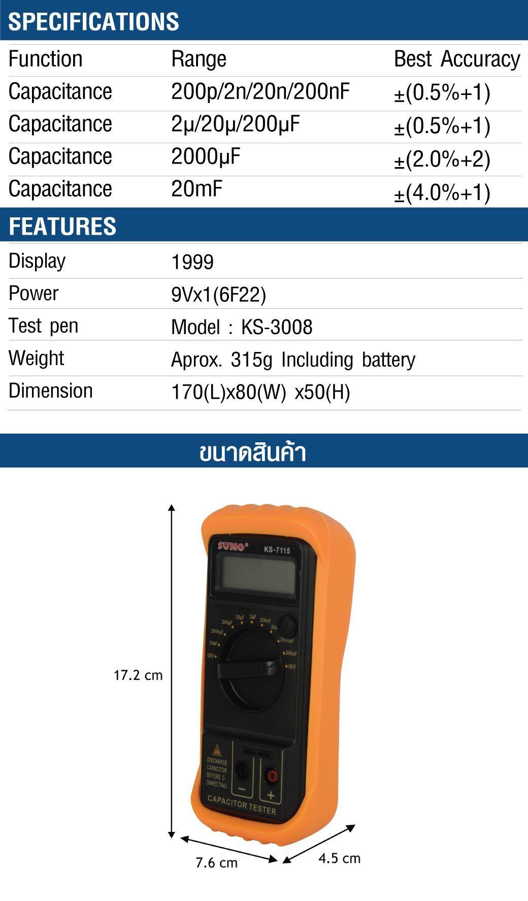 เครื่องวัดค่าคาปาซิเตอร์ สำหรับ วัดค่าคาปาซิเตอร์โดยเฉพาะ (ตัวเก็บประจุ) สามารถวัดได้ต่ำสุดได้ถึง 200pF และสูงสุด 20mF