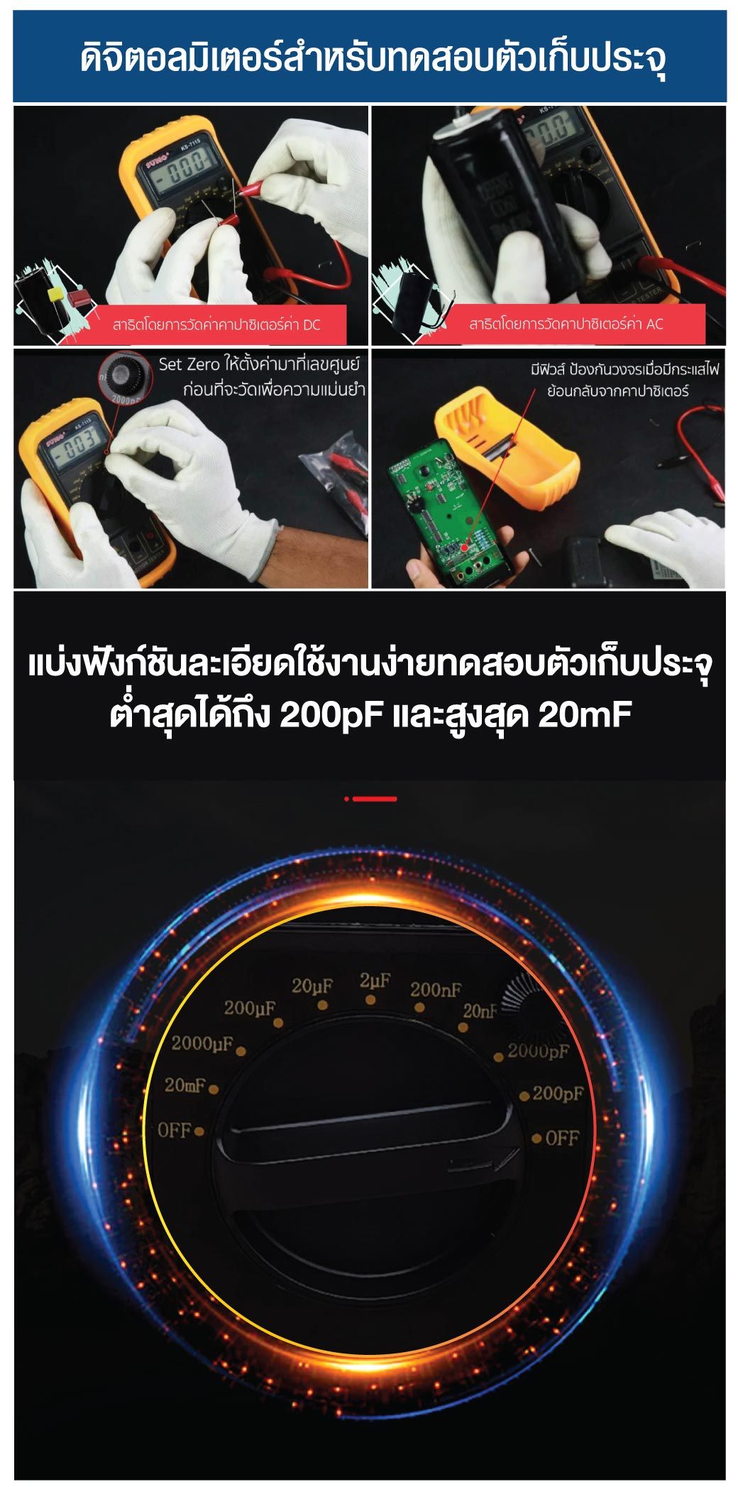 • ทดสอบตัวเก็บประจุต่ำสุดได้ถึง 200pF และสูงสุด 20mF