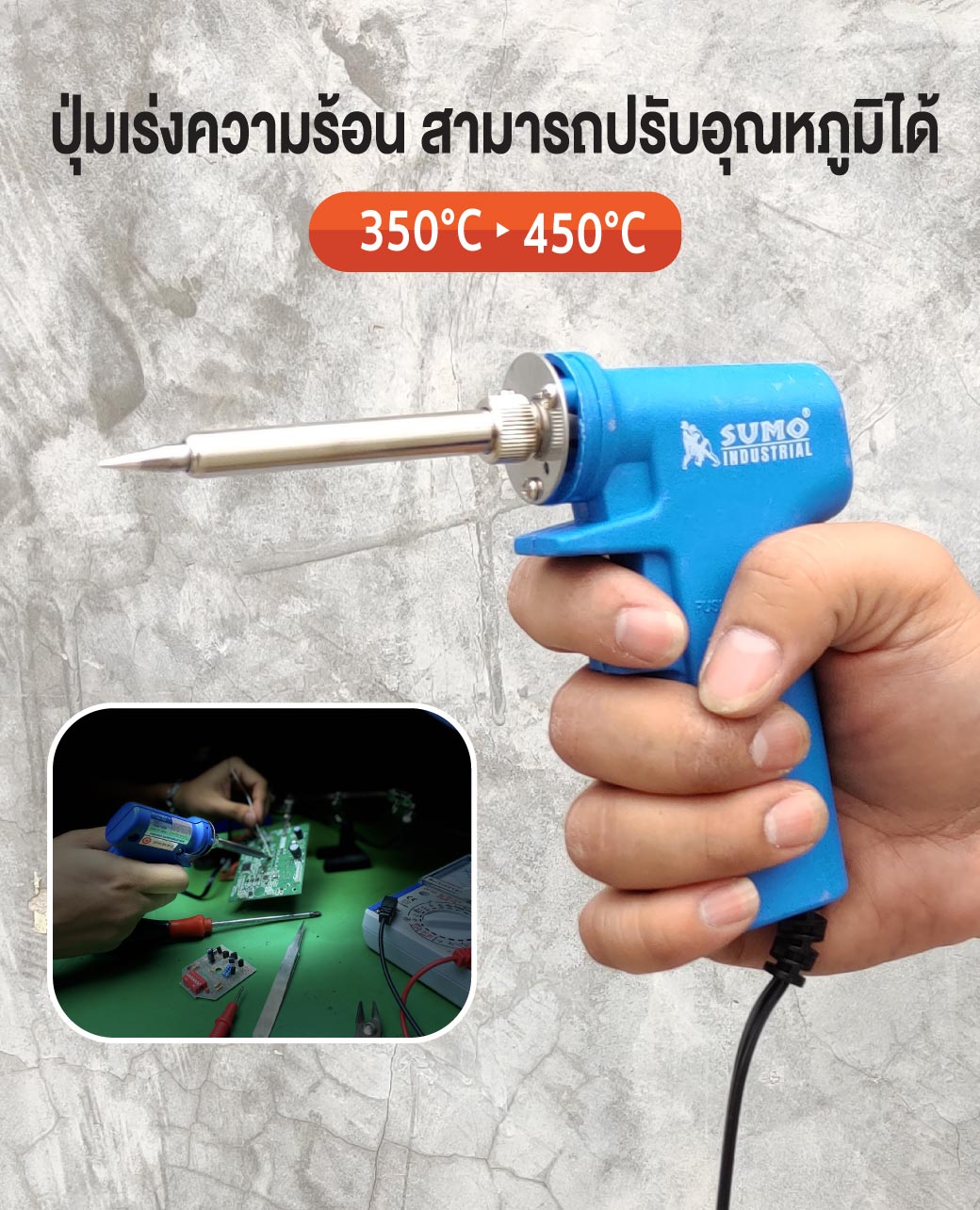 หัวแร้งปืน ปรับอุณหภูมิได้ 350ºC-450°C สำหรับงานบัดกรี เช่น การใส่ และการถอดอุปกรณ์ของวงจร อิเล็กทรอนิกส์ เมนบอร์ด เป็นต้น