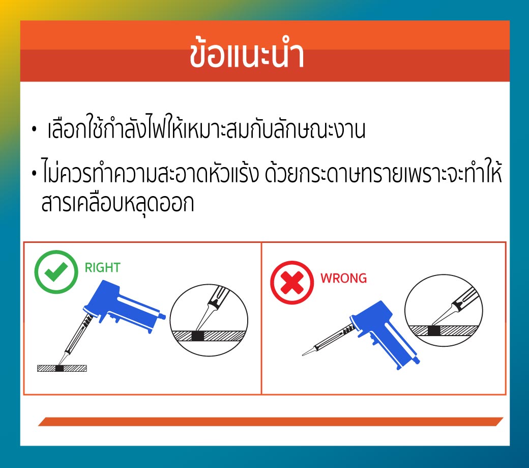 • ไม่ควรทำความสะอาดหัวแร้งด้วยกระดาษทราย เพราะจะทำให้สารเคลือบหลุดออก