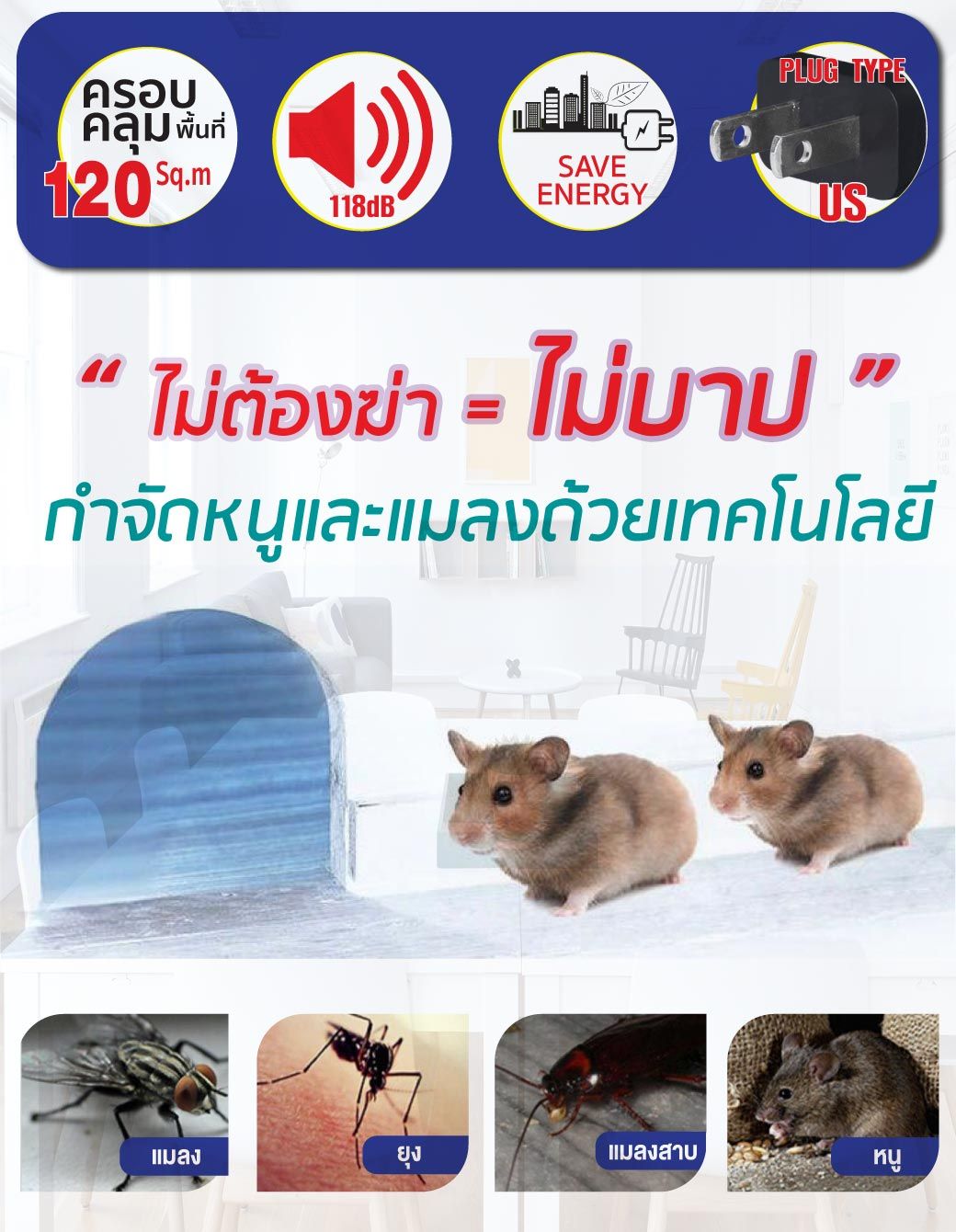 เครื่องไล่หนู และแมลงสาบ ขับไล่ ไล่หนู ไล่แมลงสาบ สัตว์ที่มีฟันแทะที่อยู่ในจำพวกหนู สัตว์ตัวเล็กๆ เช่น แมงมุม มด แมลงสาบ